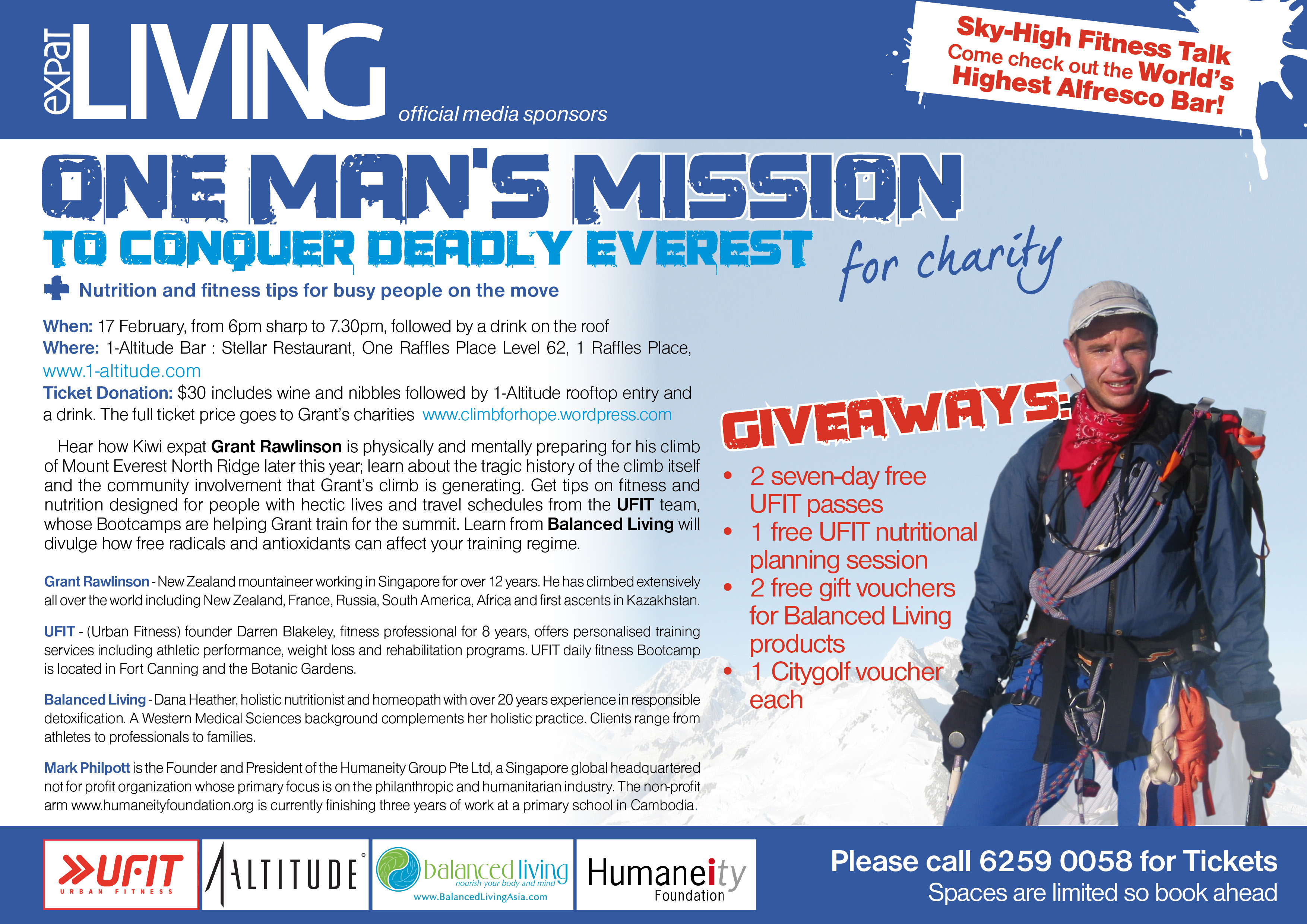 See the attached flyer here for information about my Everest 2011 presentation evening. This will be held on February 17th at the spectacular location at 1-Altitude bar, 282m above sea-level – the highest bar in Singapore on the highest building and the highest point in Singapore! Ticket price includes wine and nibbles and free golf simulator vouchers, plus entry to the rooftop bar for sunset cocktails. Over $80 worth of freebies all for $30 and the best thing is, all proceeds from the event go directly to my two charities HUMANEITY and the CAI.