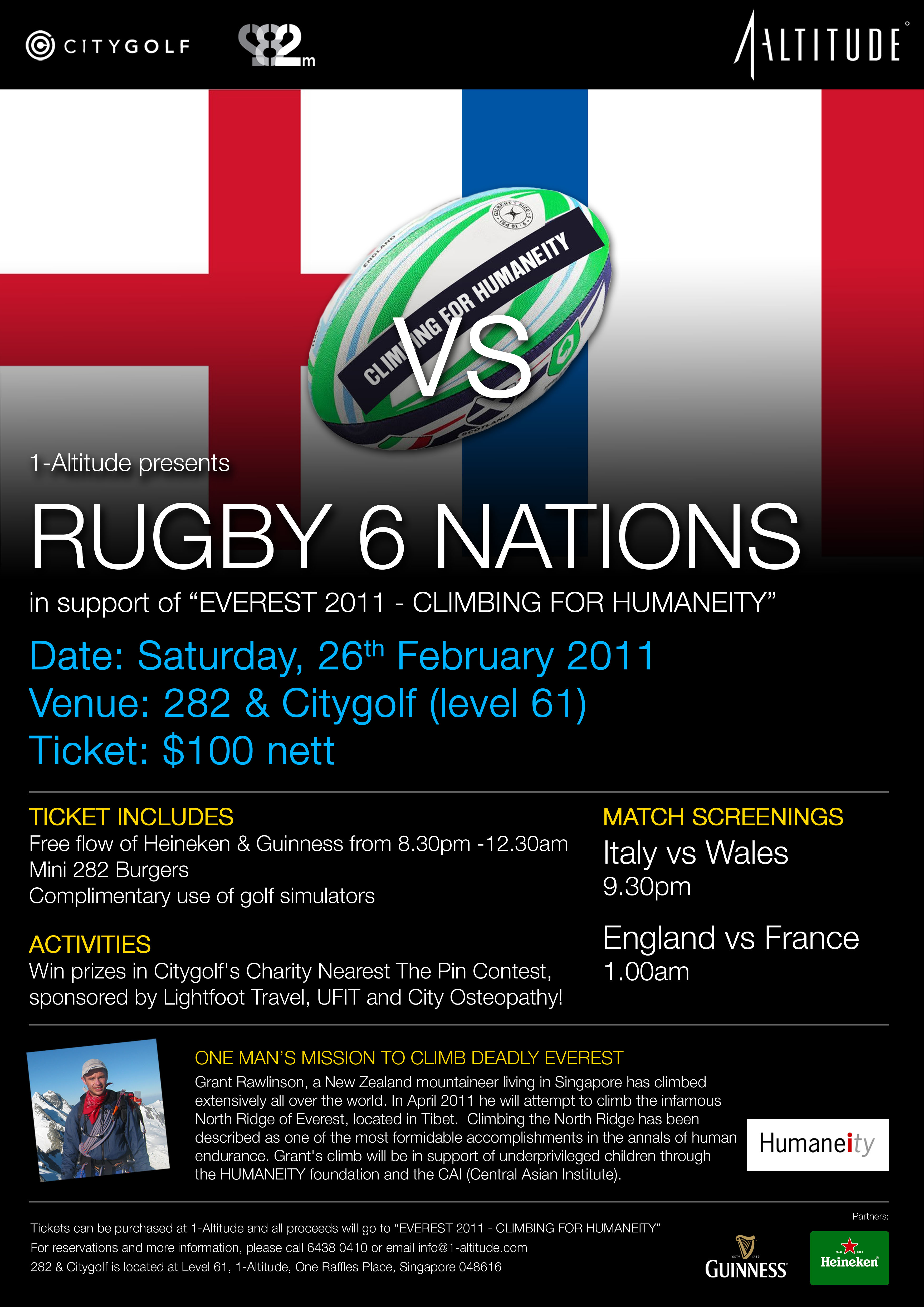 This Saturday 26th February starting at 8:30PM I am holding the 6 nations rugby party in support of Everest 2011 – Climbing for Humaneity. The party is held at Citygolf Sportsbar, 61st floor, 1 Raffles place, in surely what is the most stunning view of any sports bar in Singapore.