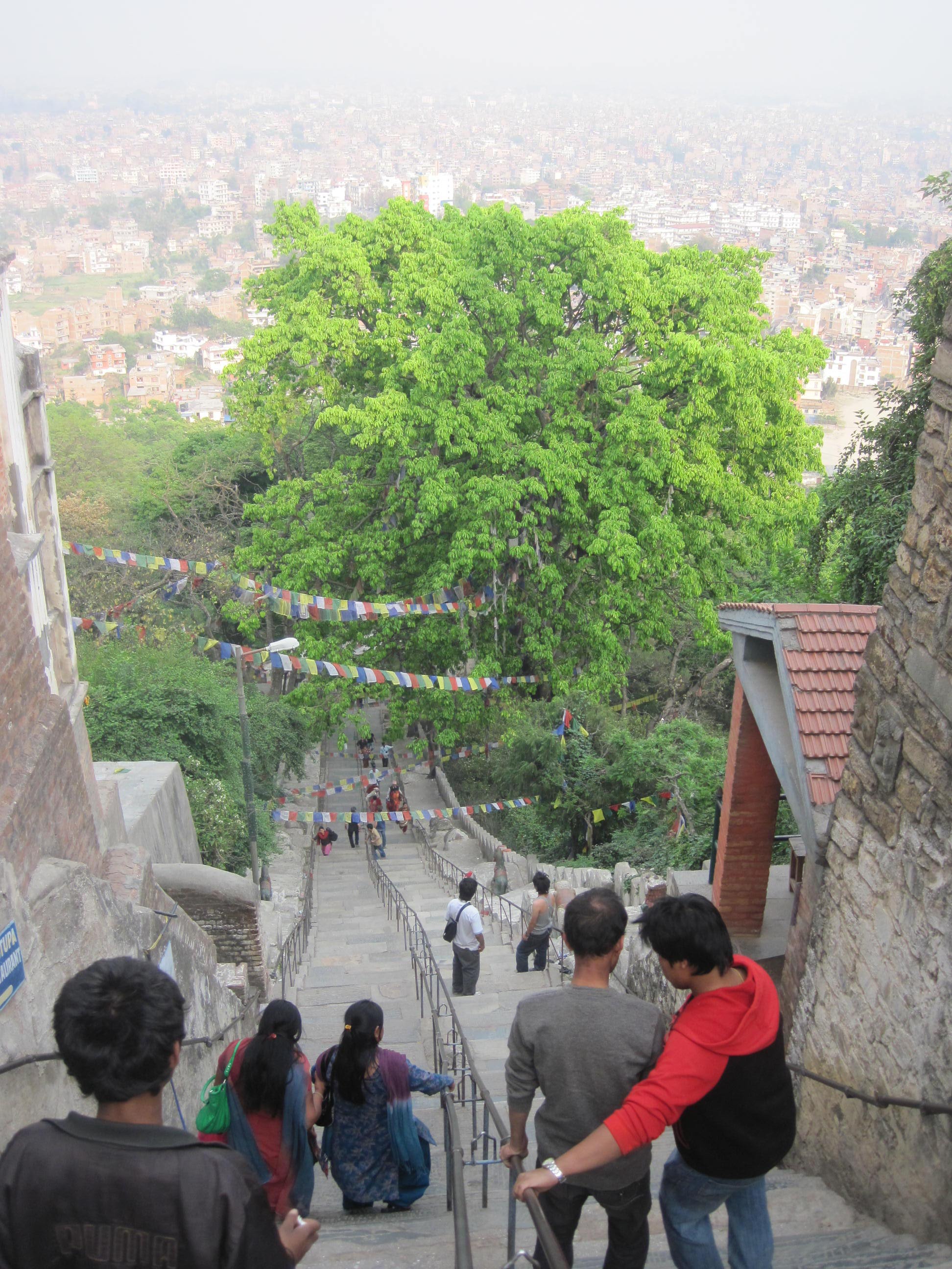 As we reached Kathmandu Durbur Square, we were swarmed by peddlers. The place was crazy. There was a concert going on and there were so many people. We felt like we had to get out of the place soon. We decided to head to Monkey Temple which took us an hour to walk there. It took us longer as we got lost along the way. Monkey Temple was much nicer and serene. It is on top of a hill and the paranomic view was breath-taking, [Grants note: partly also because the haze and pollution made it hard to breathe!]. It would have been much nicer if it wasn’t so hazy from the pollution. We spent some time there, watching the monkeys being chased by the stray dogs and watching people turn the prayer wheels. It was also sad to see many beggars and street children asking for money.