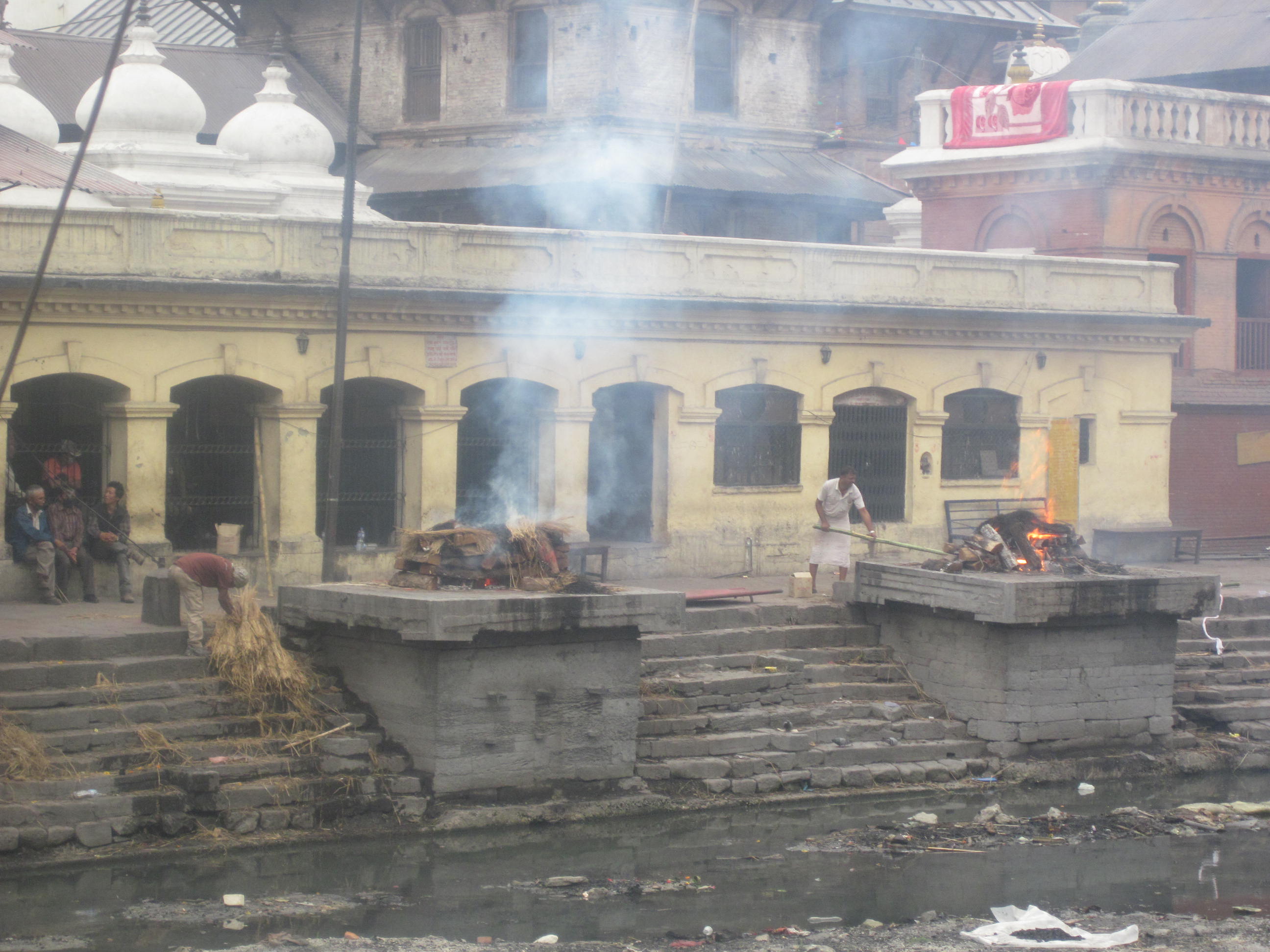 Bodies being cremated publicly in Pashupatinath Hindu temple.