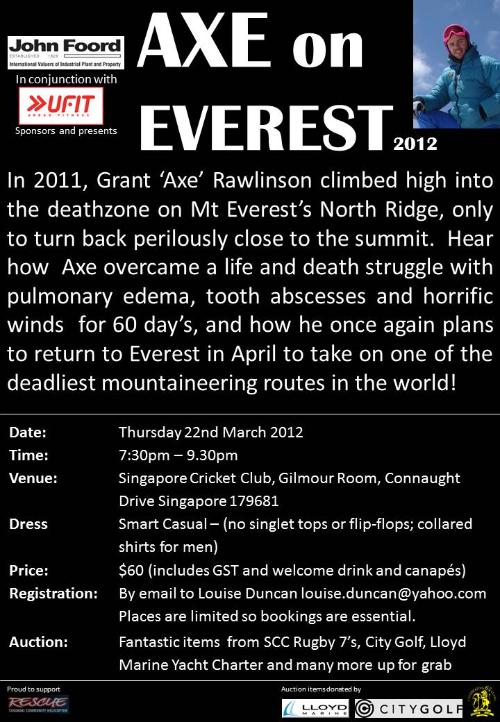 With only 8 days to go before I leave I am happy to announce I will having a farewell presentation evening at the Singapore Cricket Club next Thursday, 22 March at 7:30PM. Registration details are on the link below. Seats are limited so book now to confirm your space. Some awesome auction items up for grabs also including Yacht Charters (courtesy of Lloyd Marine), Citygolf Gold and Silver memberships (courtesy of Citygolf), SCC Sevens 2012 VIP Chairman’s box tickets, Phuket luxury villa stay (courtesy of John Hunt), Rock climbing experiences and more! The evening is also in support of the Taranaki Rescue Helicopter Trust.