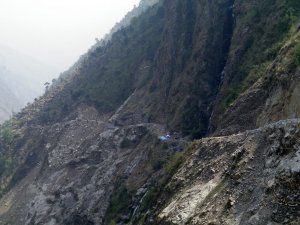 I leave at 7am walking. I walk initially along a track, then cross the river to the road. You can actually take a 4wd jeep or bus from BhulBhule, a further 20km to the village of Chamche. The road is rough, in some parts literally carved into the side of vertical cliffs above the river. I decided to walk this and made good time. I stop in Jagat village for lunch of noodles and black tea. I practise speaking some Nepali with some phrases from the Lonely Planet guide book to a little girl called Asmi whose mother cooks me lunch. She is very cute and is 4 years old with snot coming out her nose.