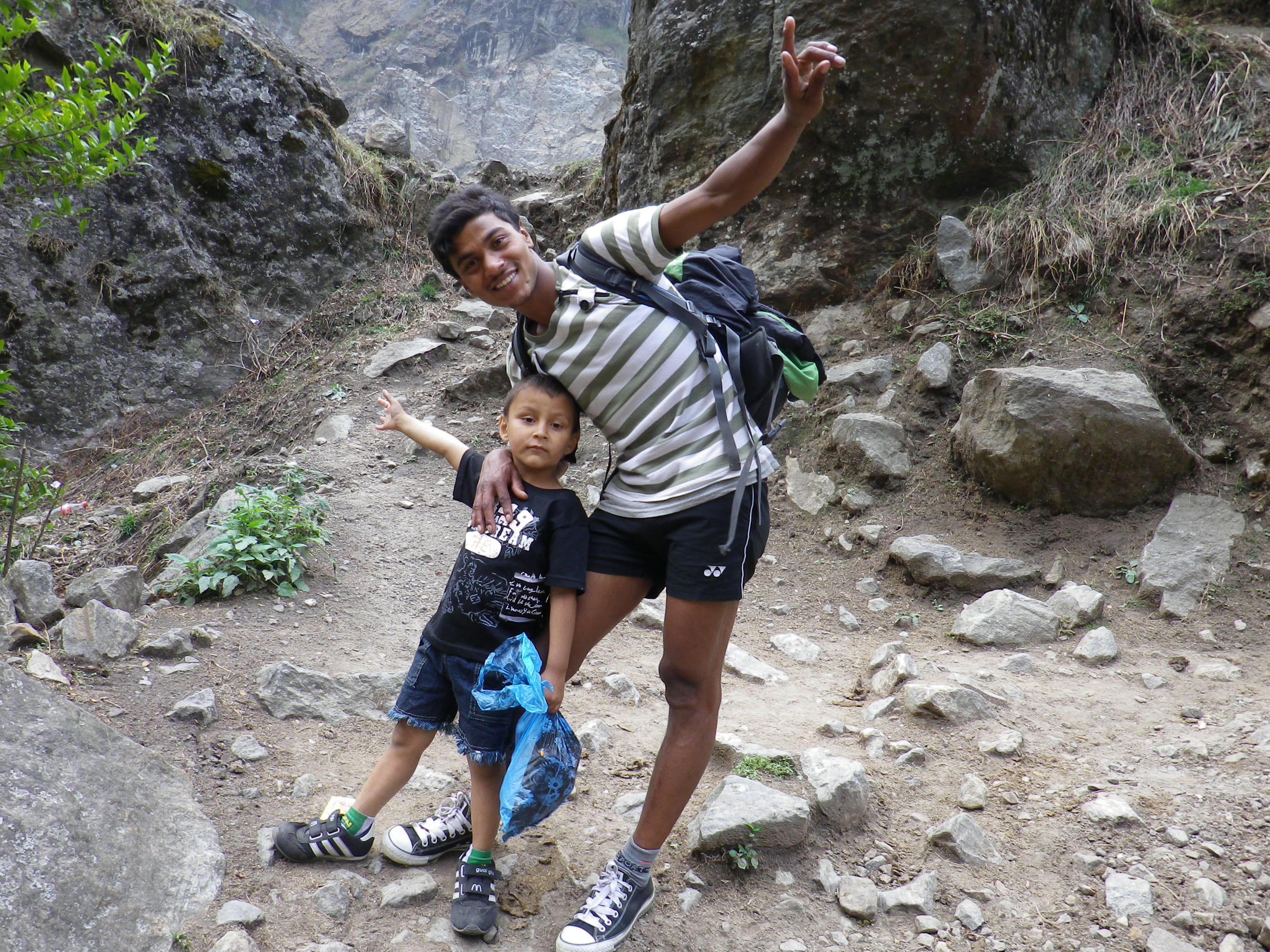 I continue walking up the hill and begin talking to the young man with the small boy. His name is Keshie and he is 19 years old. The small boy is his nephew Sunim. Sunim is 5 years old and studies at a boarding school in Besi Sahar. They come from the village of Chame, 56km from Besi Sahar, a 2 day walk. Keshie is walking Sunim (and as it turns out his other nephew Pratik who is further up the track) home for their school holidays. It is a steep hill and little Sunim quietly walks along behind his uncle. Never complaining once, occasionally getting a piggy back from his uncle if the steps get to high for his little legs. It turns out today they are heading to Dhorapani.