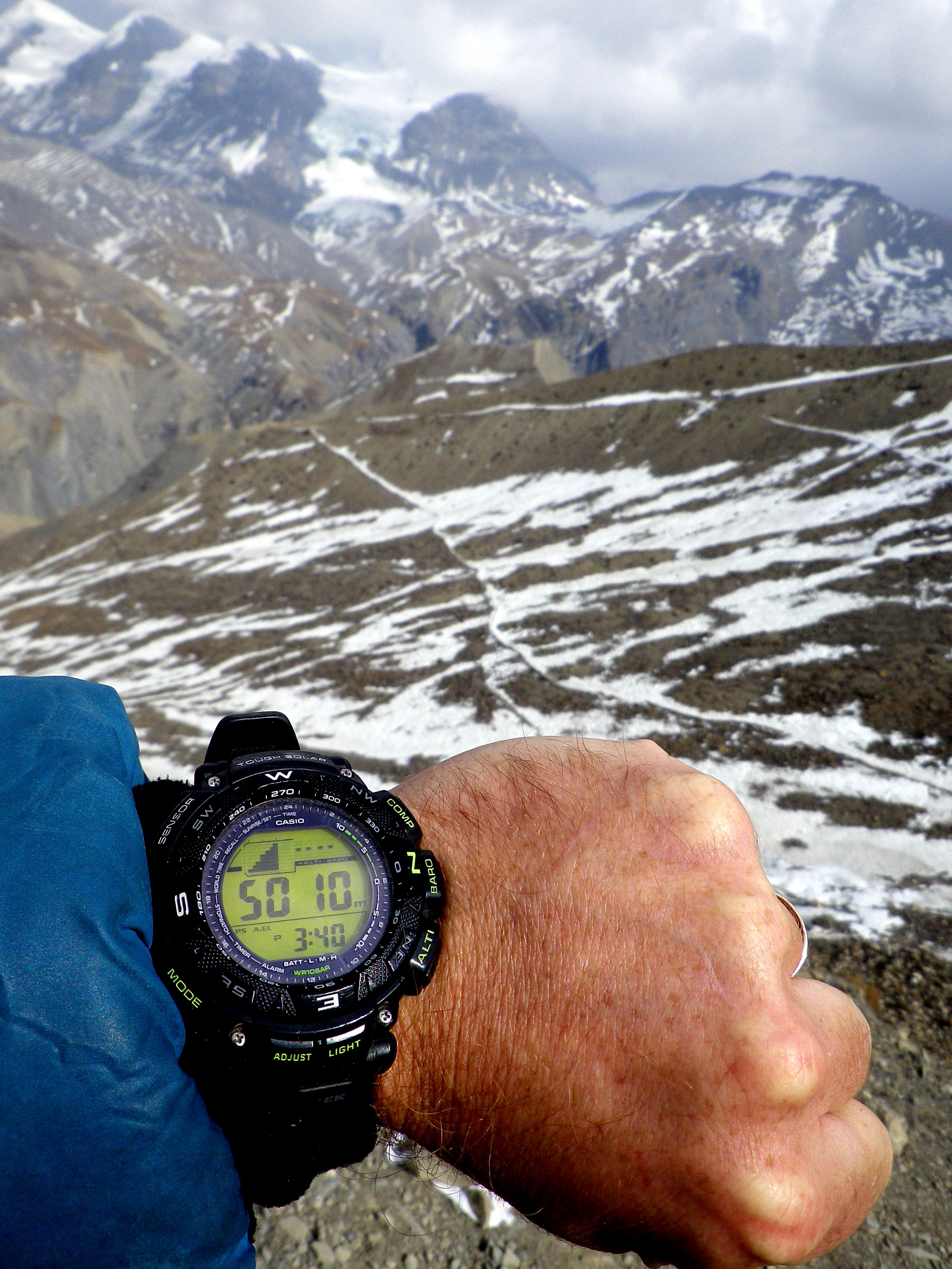 After a quick cup of black tea in the high camp lodge I head off further up the trail towards the Thorung La pass. I want to climb high during the day and sleep lower during the evening. From experience this helps me acclimatise faster. I walk very slowly and the altitude makes it hard work. I stop when my watch reads 5000m and sit and rest at a good point on the ridge where I have some nice view.