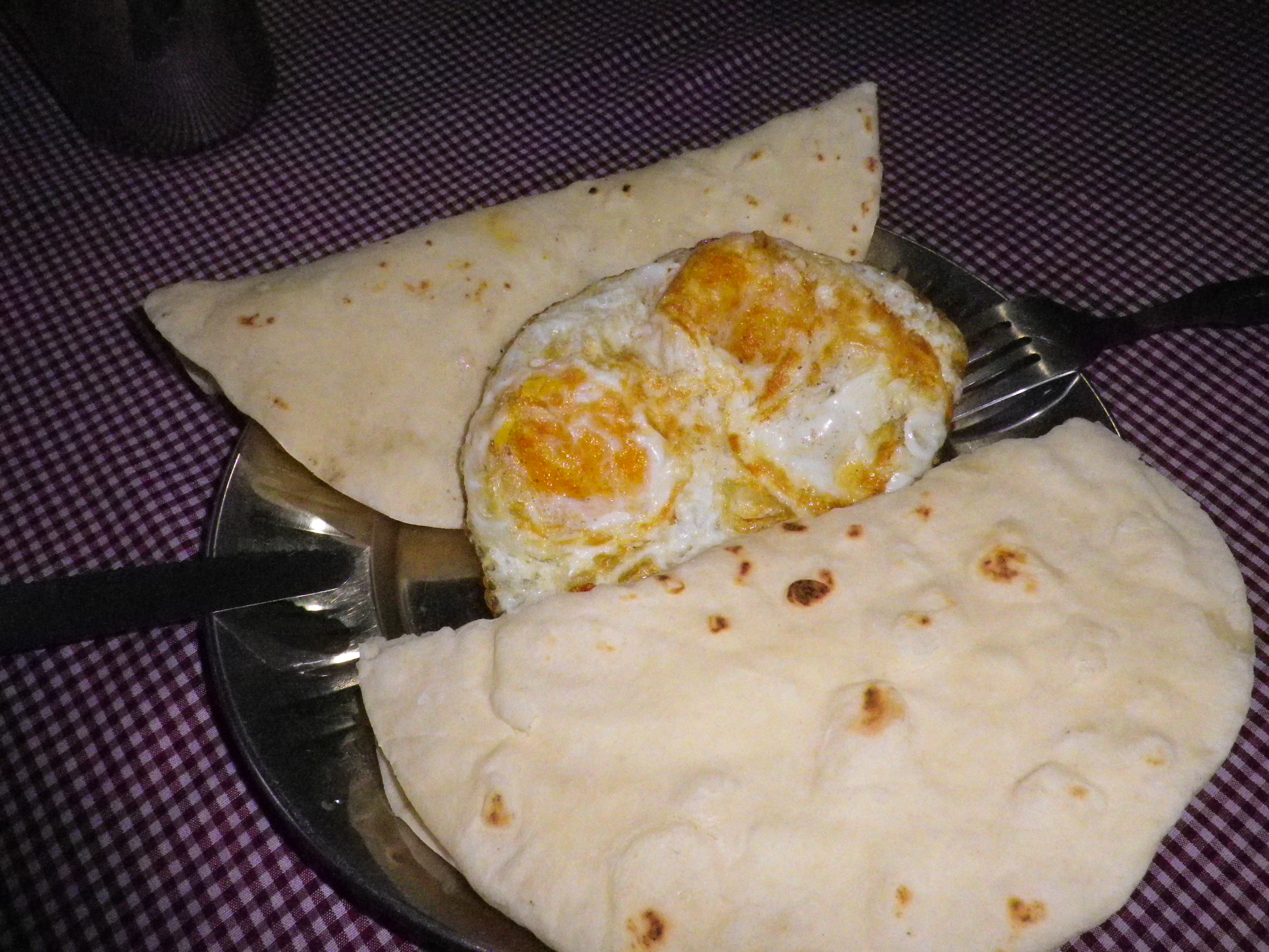 I wander around and take some photos of the sun rising over the Annapurna range before I spy a kitchen lady who makes me chapati and fried egg for breakfast.