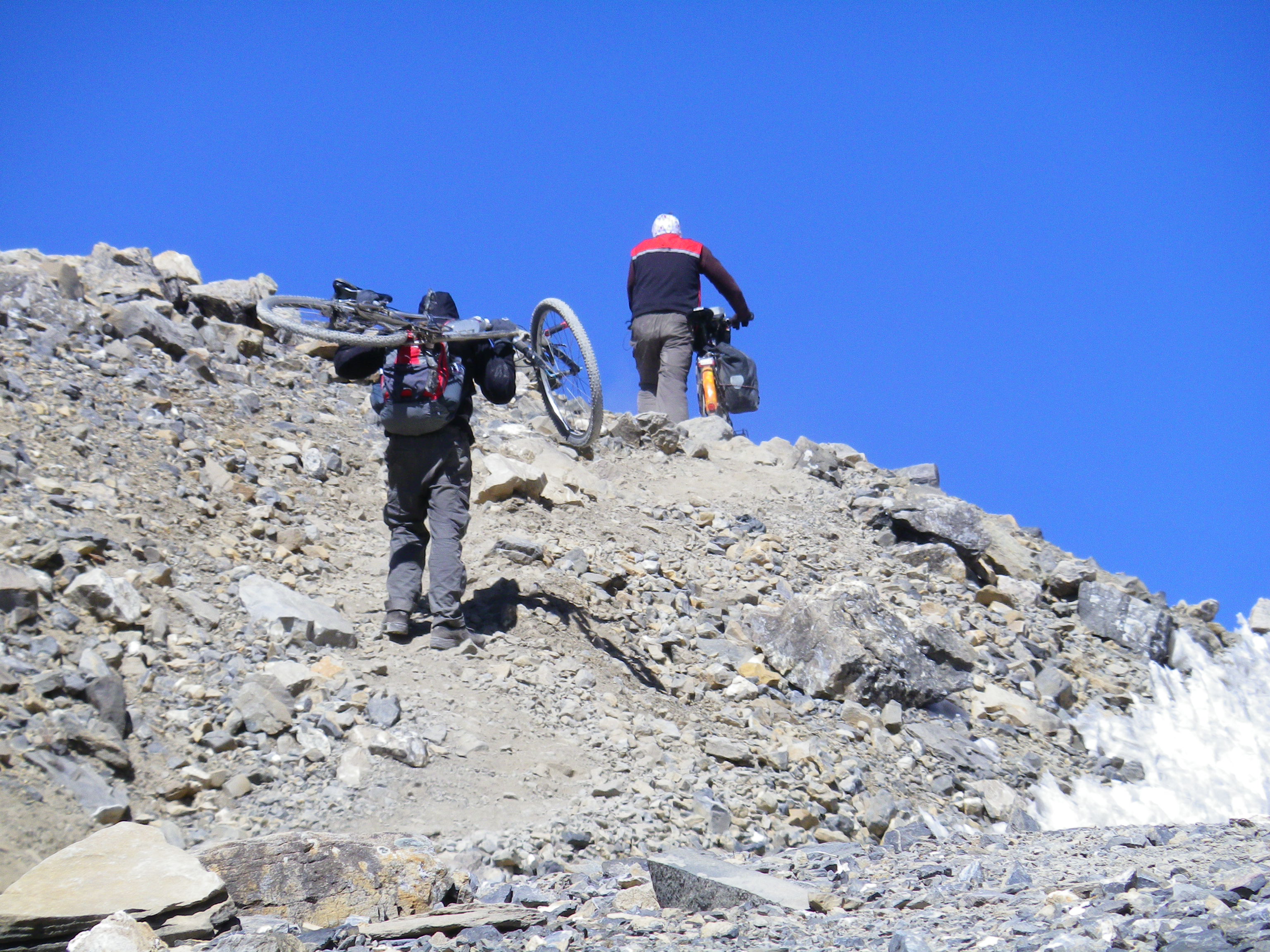 I start to pass groups of people around 5100m. At 5200m I think my eyes are playing tricks with me as I see two people carrying bicycles. I soon catch them. They look tired. One is from Austria and one is from Australia. The Australaian has a mountain bike complete with front suspension. The Austrian has a town bike with no front suspension and nice big mudguards. It looks heavy. I ask him why he is using this bike, he says it is sentimental as he has ridden here all the way from Austria. They are having to carry/push their bikes up much of the path. It looks very hard work.