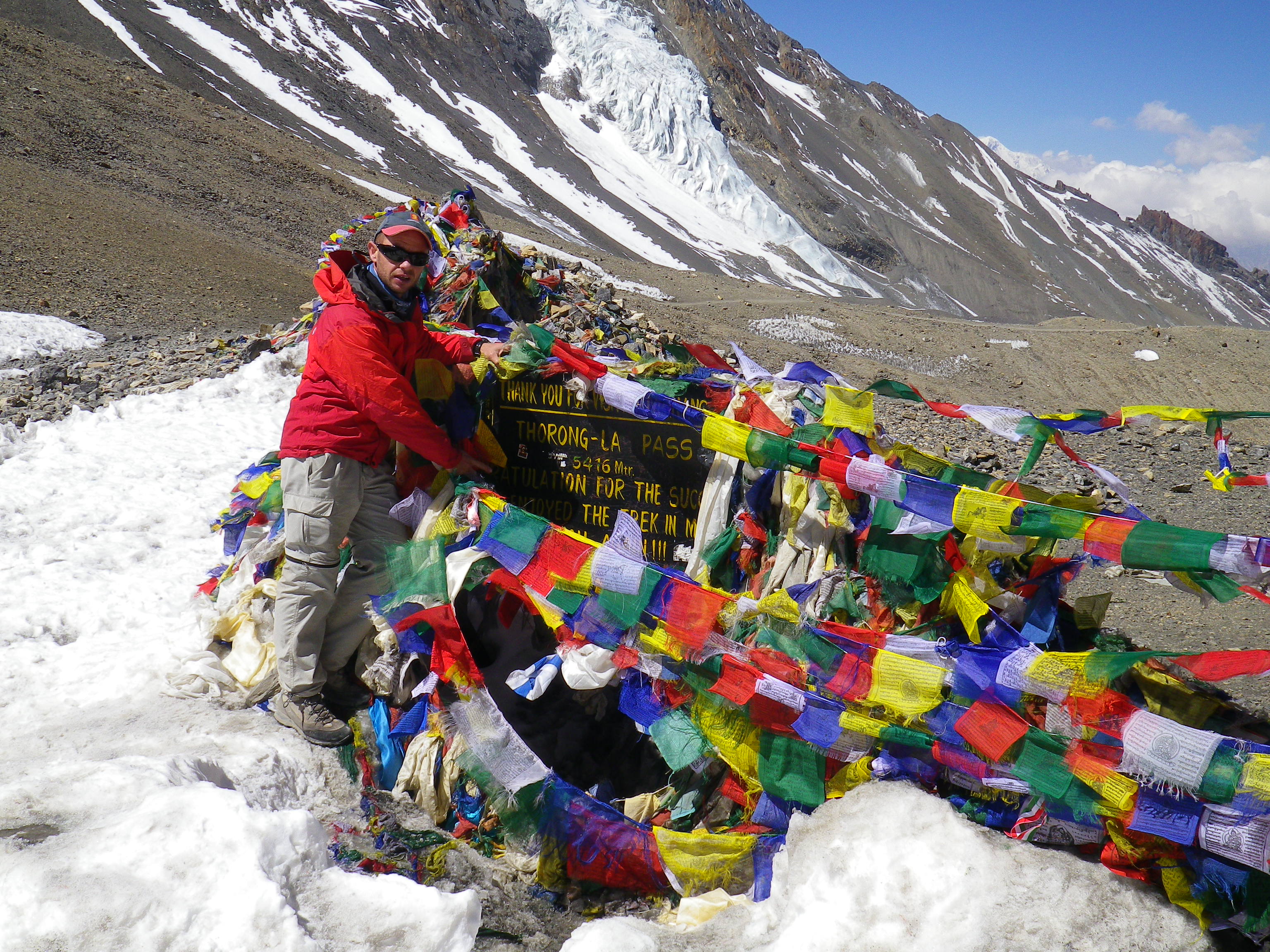 I ask some trekkers to take a photo of me on the pass. I make a satelite phone update on my blog (listen to the voice post here). Even at this altitude my brain is not functionig well. I try and convert 5410m into feet and come up with just under 20,000 feet (it should be just over 16,000 feet).