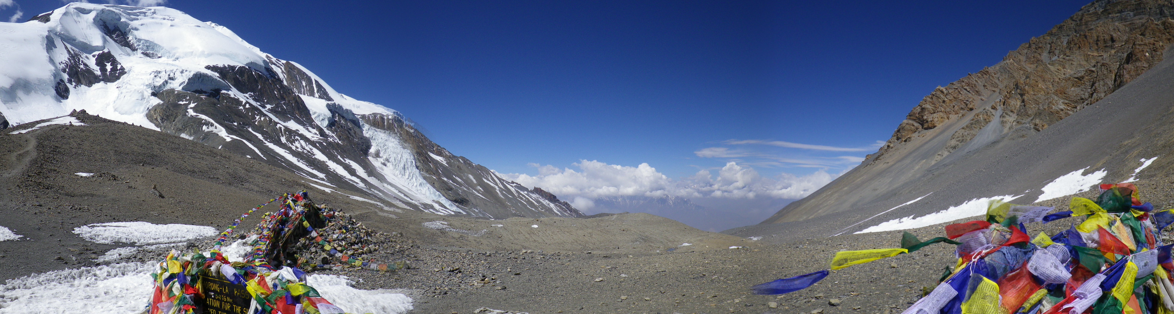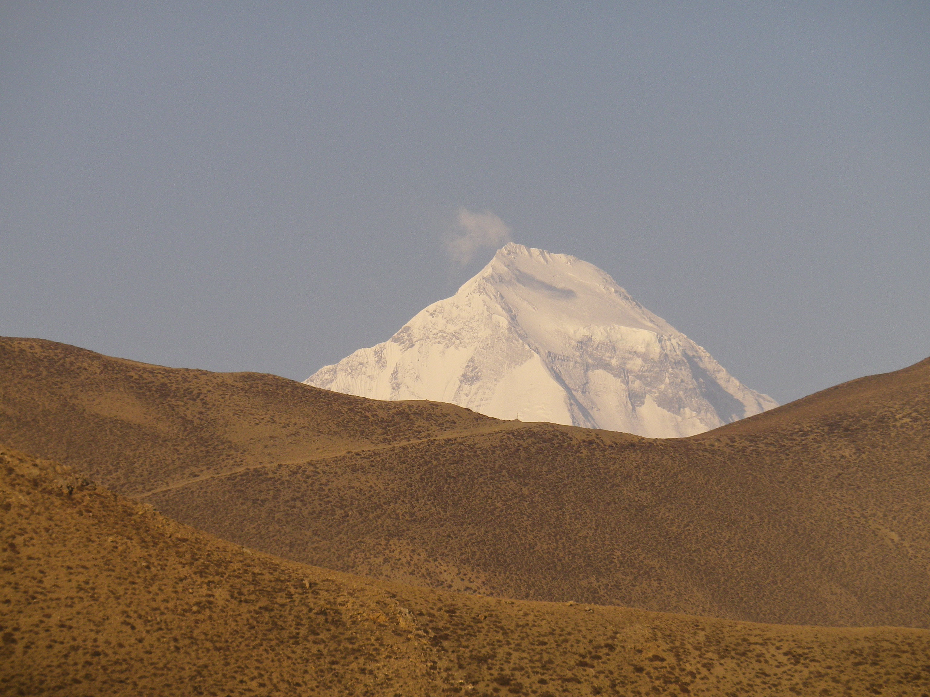 I continue past them up endless moraine humps until I reach the Thorong La, 3 hrs after leaving Thorung Pedi. Its windy and cold on the pass. To my left the high snowy peak of Khatung Kang (6484m)towers impressively above. Directly in front in the distance I can just make out Dhaulaghiri (8167m). Although its very hazy and I was hoping for a much better view.