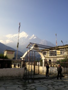 I wake with a slight headache and feeling thirsty. Probably due to the beer. Before breakfast I take a walk up the hill behind the lodge and take some photo’s of the sun rising over the Annapurna.