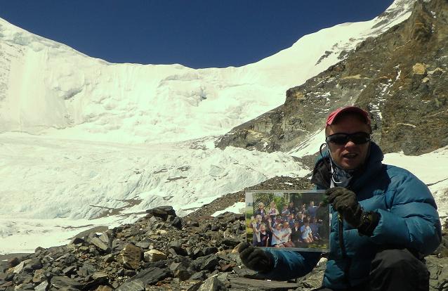 I dont feel like a mountaineer. I feel like a tourist in the mountains, wandering around with no fixed objective. I need to keep reminding myself that while I am waiting here my body is acclimatising. I put on my climbing boots for the first time and go for a walk for 30 minutes up towards the North Col. Margaret comes with me. Margaret takes some photo’s with sponsors flags for me. I also take a photo with the picture of the school children from Room 5 at St Josephs School, Stratford. (See below). These kids are following my progress on Everest which is very cool. I look forward to visiting them in Stratford when I am back there after Everest.