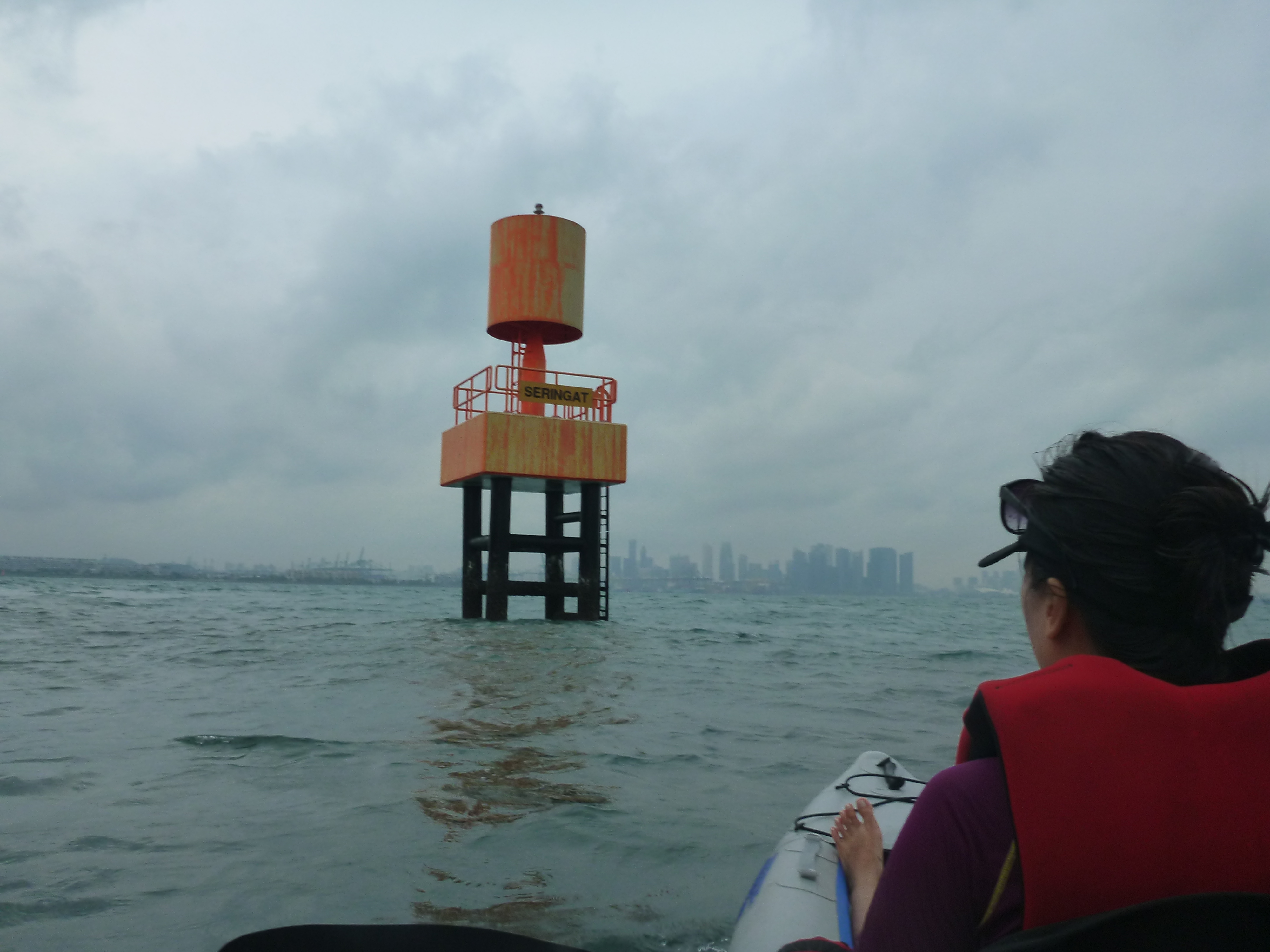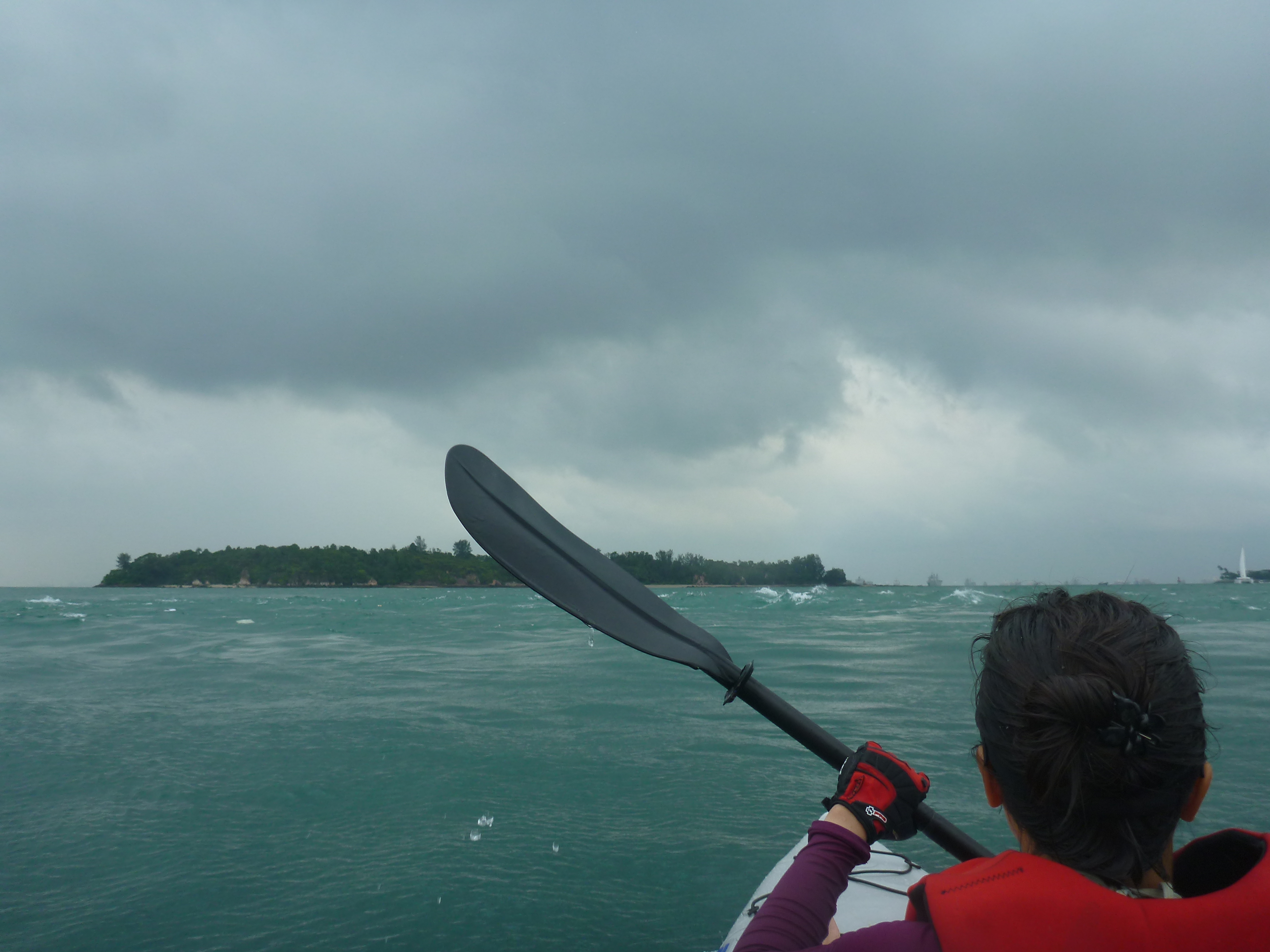 Getting to St John’s was not a problem as the current was whistling along from west to east. We cruised along easily with the current, making speeds of 6 – 8 km/hour. There is a high number of fast ferries cruising around the coast of Sentosa, and we had to cross the strait from Sentosa to Tekukor Island in gaps between this vessel traffic. This was a little hairy and we paddled hard to get across here. The day was overcast and windy. The wind was whipping the sea into a choppy mess and coupled with the swells from the vessels zooming fast at high-speed we soon had water pouring over the side of the Divorce Machine. Compared to the relatively calm water at Pulau Ubin the week before it was definitely a more intense experience.