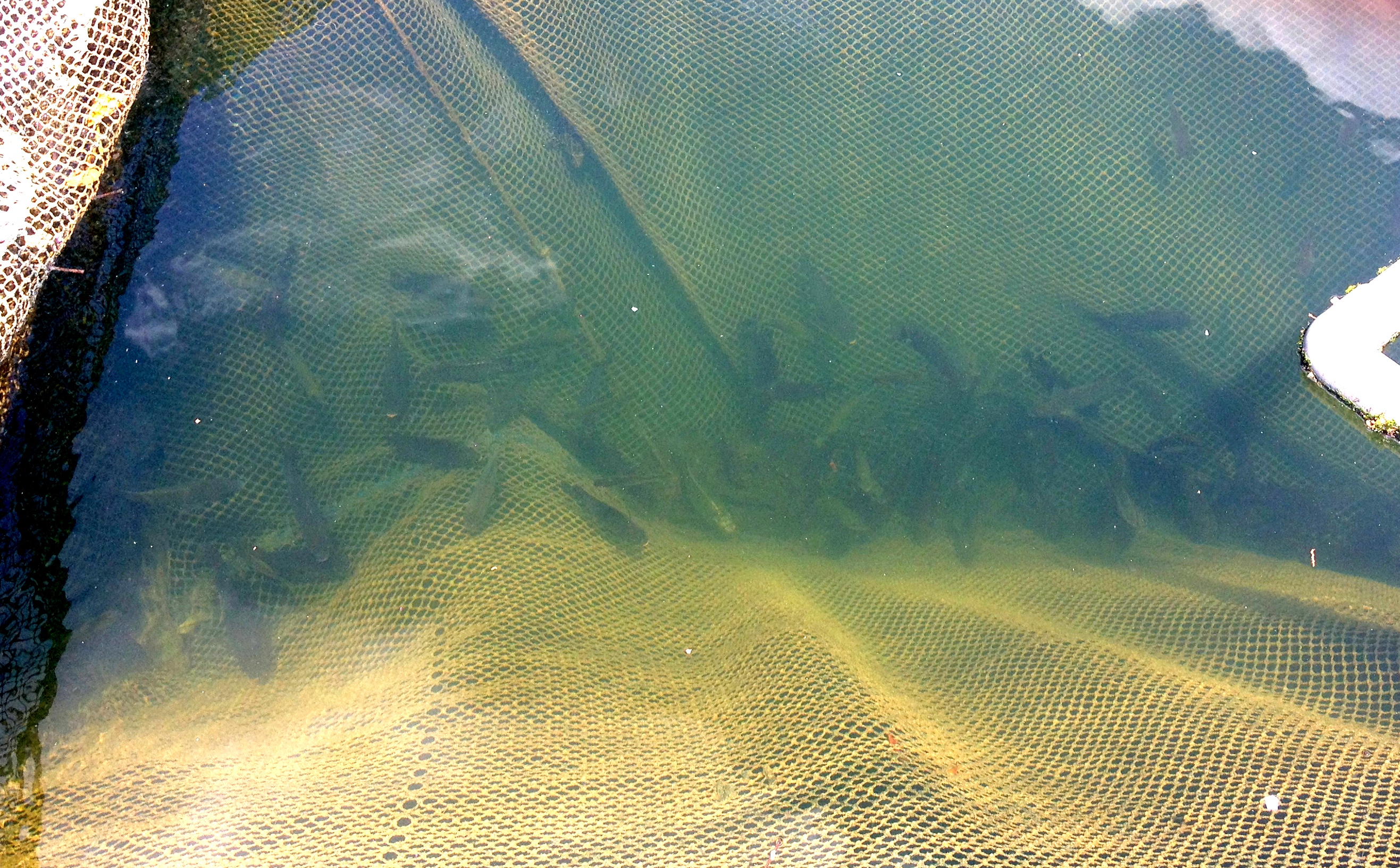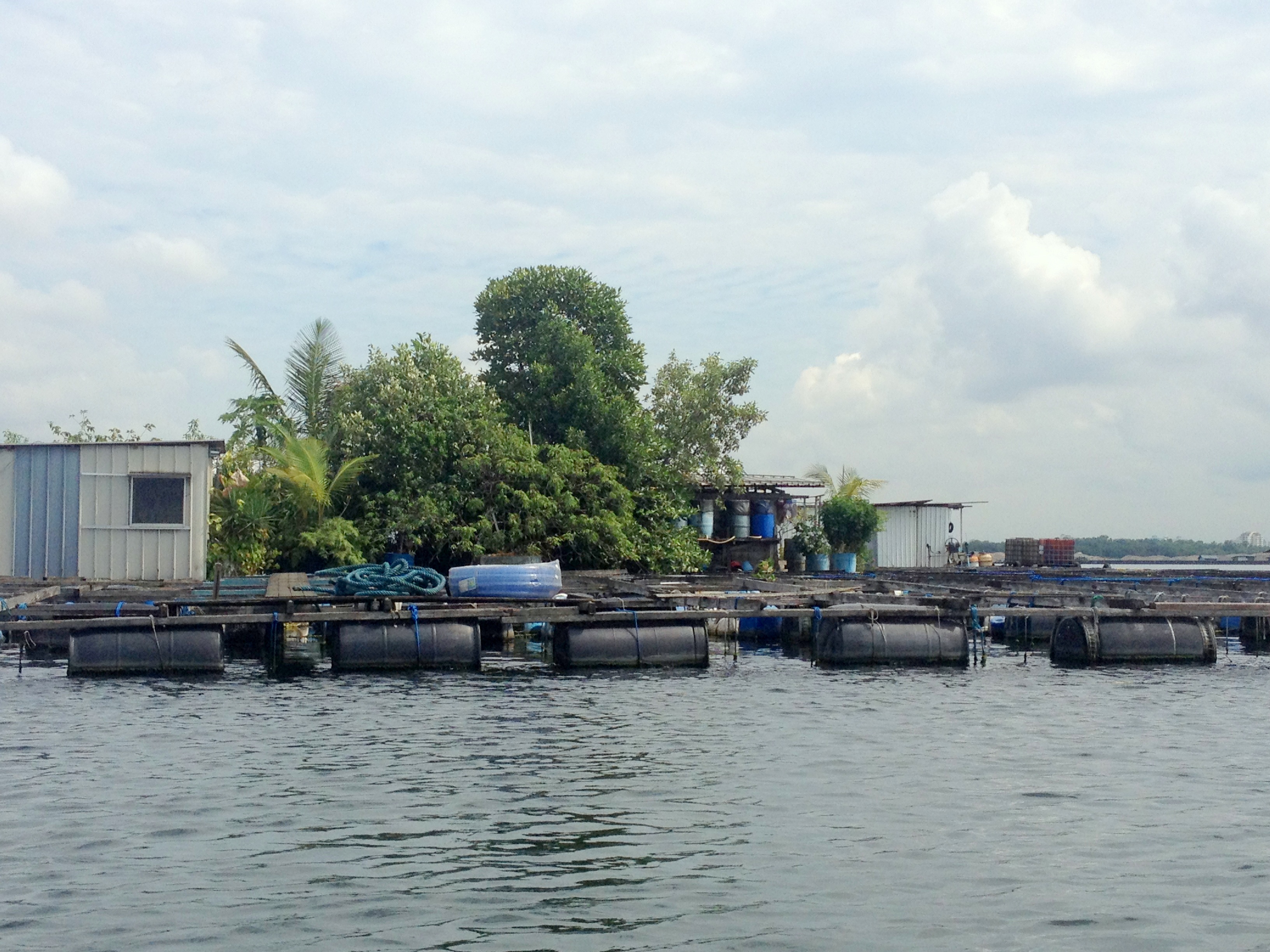 The area off Sungei Buloh and slightly to the west is full of floating fish farms (some people refer to them as ‘kelongs’). ย From previous experience, we knew kelongs are often guarded by one or two noisy dogs which get very excited as you paddle past. Some of the kelongs were very large, and even had their own on-board gardens. ย As we paddled around the back side of one large kelong, we came across two Chinese gentlemen fishing. ย “Hello, ni hao?” I called. ย “Hello, how are you?” came back a very friendly reply. ย After some small chit-chat it was evident they spoke as much english as I spoke mandarin, so Stephanie took over the conversation. ย “Ni yao her cafe ma?” ย (“Do you want to drink coffee?”) one of the men shouted out(his name as we found later was ‘Mr An’). ย We looked at each other “Yeah that would be great!”. ย It was exciting to get invited onto a kelong as we had never had the opportunity to be on board one before. ย We thanked them profusely for allowing us the chance to tour their kelong and that’s when Mr An explained that this is not a kelong but a fish farm. Kelong is used to catch wild fish while fish farm is for breeding fish. Thanks to our friendly hosts, we learnt lots of new things today. They were really nice guys and as Stephanie translated our conversation, they gave us a wonderful tour of their fish farm. ย We sat and drank coffee inside their small shelter and the conversation soon shifted to the subject of crocodiles. “Yes we see the crocodiles very frequently” Mr An explained. ย “But they never come out into the channel here, they always stay close to the mangroves, closer to the shore”. ย After the coffee we were expecting to head off, when Mr An said “OK now you meet the boss of the farm!”.