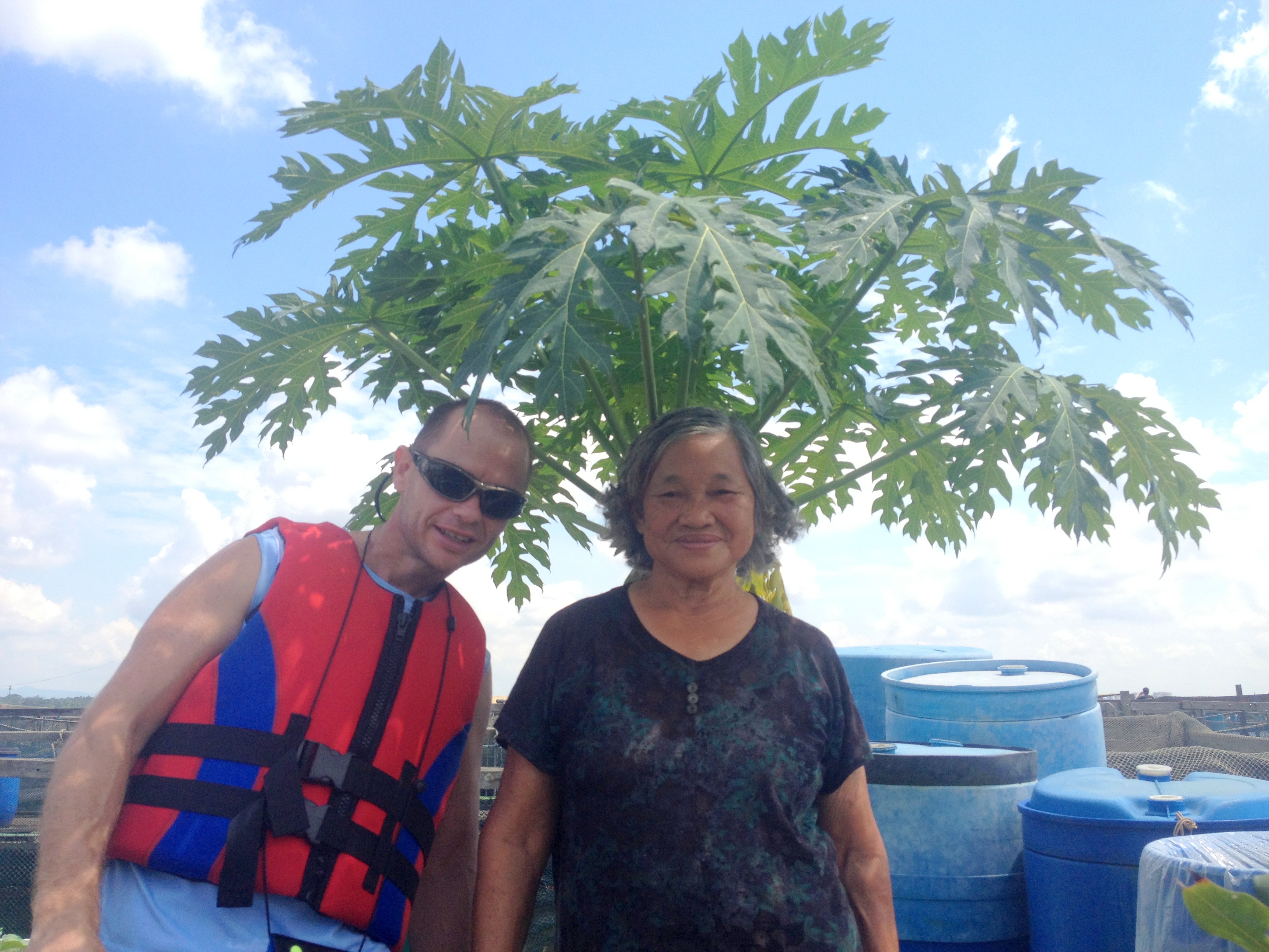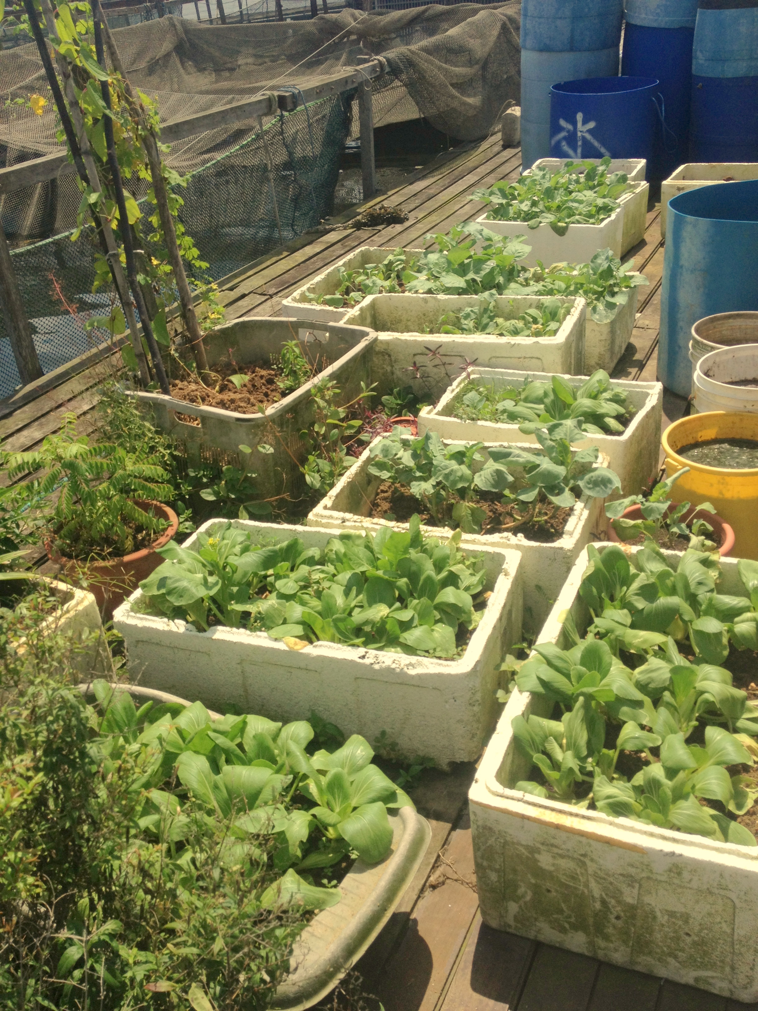 It turned out the farm is run by Mr An’s uncle. ย He turned out to be a smiley faced older man who was 75 years old. ย One look at his sun tanned, fit body you could tell this was a man who had spent a life working hard in the outdoors and was in great shape. ย “Angmoh!!!!!!” ย (a term generally used to describe a ย ‘white person’ in Singapore) he shouted loudly with a huge smile on his face. ย I got the feeling he had not seen many ‘Angmohs’ before). ย He shouted it out repeatedly to a couple of other men who were helping him also. ย We all had a chuckle and took some photographs together and before we knew it, he had invited us over to his house on the opposite side of the fish farm to meet his wife. ย Apparently they had lived on this floating fish farm for over ten years. ย Before this they lived close-by in a small kampong (village) on the banks of the river for twenty years. ย The kampong no-longer exists. ย He told us he could remember the Japanese invading Singapore and seeing dog fights between the English and Japanese planes. ย They gave us coke to drink and even invited us for lunch. What else do you eat on a fish farm but fresh fish of course and the lunch looked superb but we turned it down as we felt a little like we were imposing. ย I sat beside his wife and Stephanie translated our conversation. ย She also looked very strong and fit for someone in her mid 70’s. ย ย “I am fit because I eat fish every day” she proudly told Stephanie. ย “Do you ever eat lamb?” Stephanie asked her? ย She shook her head and Stephanie replied “OK next time we come out we will bring you some frozen lamb from New Zealand”. ย She was very proud to show us her garden. ย Here she grew all kinds of leafy vegetables including kailan, bittergourd, spring onions, even papaya and many other things which I could not catch the english name. ย We probably spent on hour with them but all too soon it was time to head off. ย It always amazes me how the smallest, quietest places you visit have the most friendly and charming people. ย Mr An and his family were all so genuinely friendly that it was a humbling and special experience and meeting them was really the highlight of the day for us. ย They even gave us their telephone number and invited us back again in the future.
