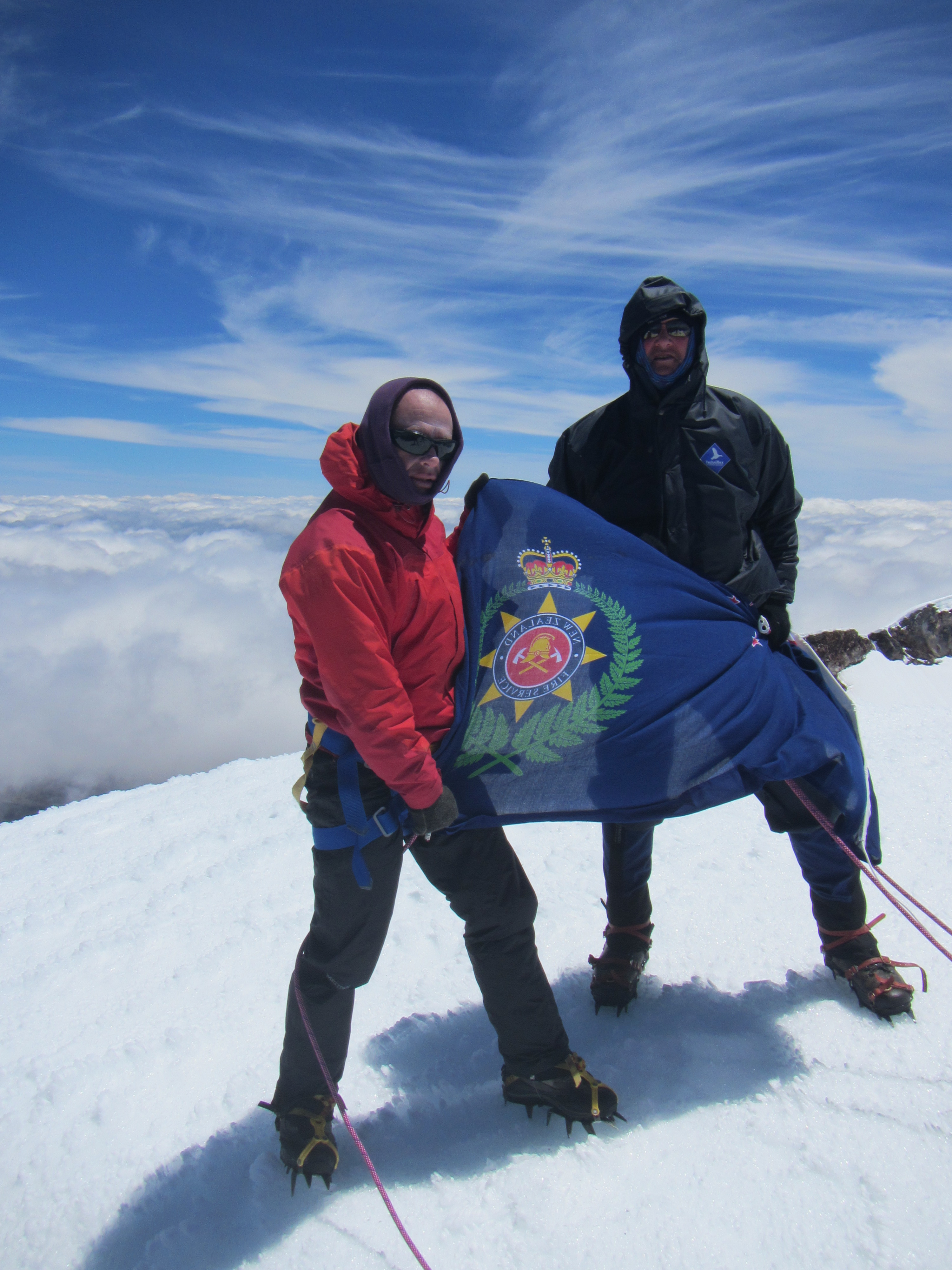 Axe and Robert Mills on the summit of Tahurangu with the NZ fire service flag. The expedition donated NZ$1000 to the Toko and Stratford volunteer fire brigades on the summit.