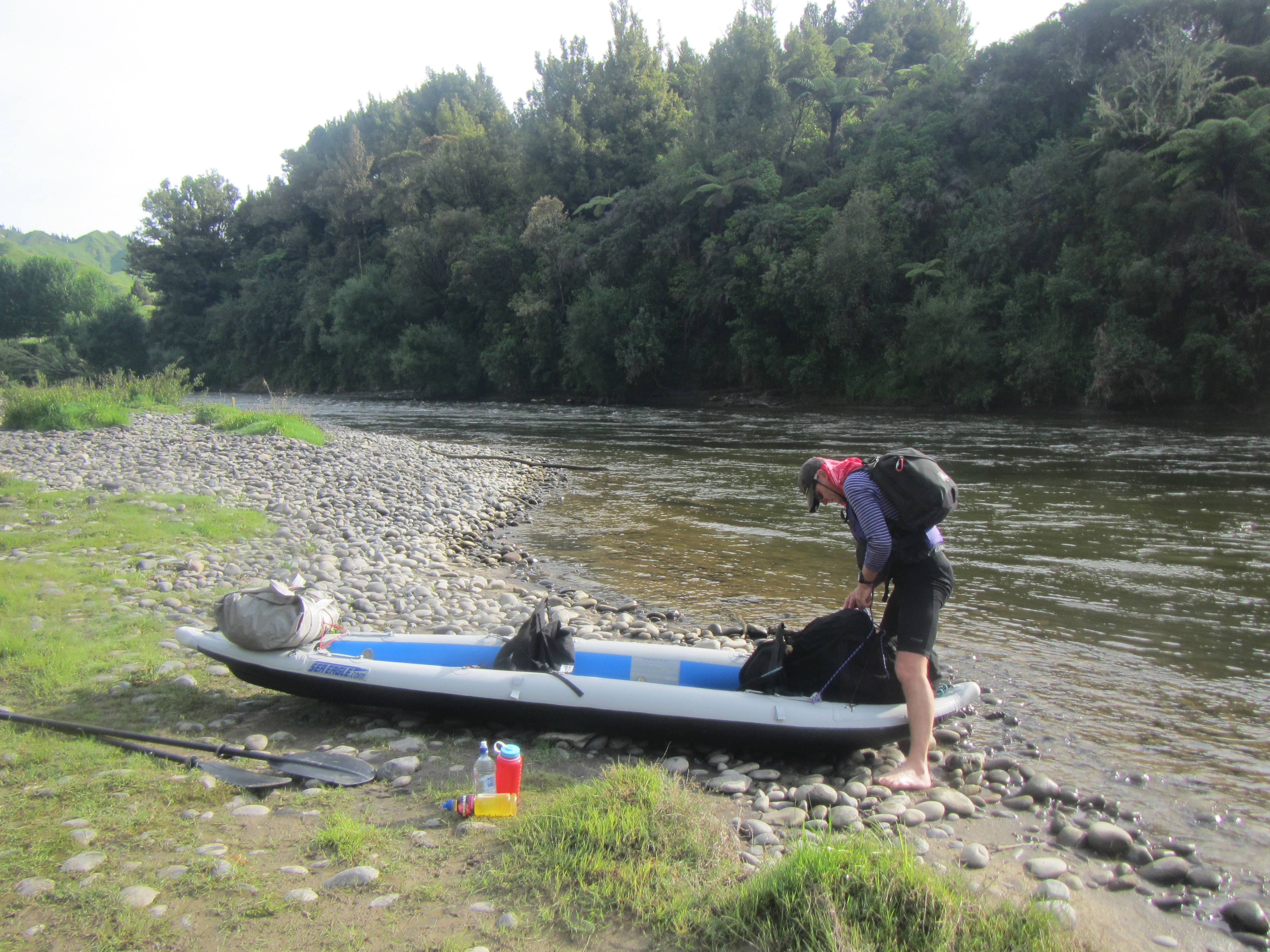 We were treated to an enormous sumptuous breakfast of sausages, bacon and eggs by Jim the legend Morrow before setting up the bikes and setting off for the 60km cycle to Taumaranui to meet the mighty Whanganui River. We chose to start paddling here because the river is too shallow further upstream. The ride from Whakapapa down 7 km (4 miles) of steep winding road was both freezing and fun. We reached top speeds of 64 km per hour on the hybrid mountain bike’s complete with panniers! We had a nice ride in 2.5 hours to reach Taumaranui. Here we did a quick grocery shop for 5 days food which we then loaded up in to the divorce machine (our sea eagle fast track inflatable kayak), under the watchful eyes of Jack and Rob who gave such helpful advice as ‘you will never get down the river in that f’in thing! You are carrying far too much food and not enough beer, and none of your gear is water proof!’