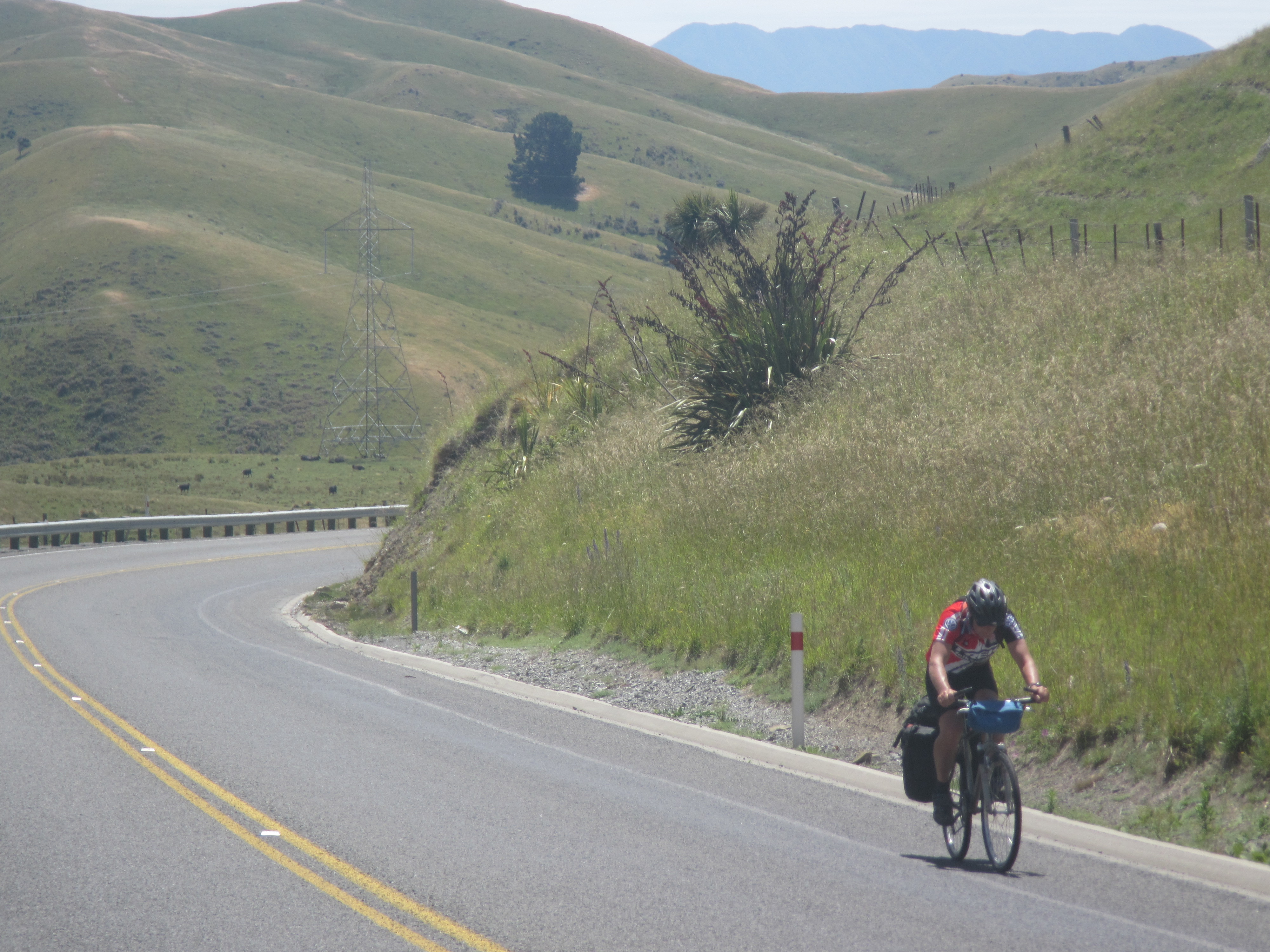 Day 11 of Peak to Peak was the morning after the Cook Strait crossing.  After 45 minutes of wild partying the night before then going to bed at 8PM we both felt a little seedy the next morning as we jumped on the bikes and headed south.  It was a beautiful day, and we were welcomed to the South Island with the first hill outside Picton to warm our legs up.  We then had a nice cruise for 20km into the nice little town of Blenheim.  My back tyre was worn out and having two flat’s already, I bought a new tyre and an  inner tube. We had lunch sitting beside the river before heading off again.  We soon hit more hills, and in the hot weather called it a day at 5pm, only managing a total of 80km.