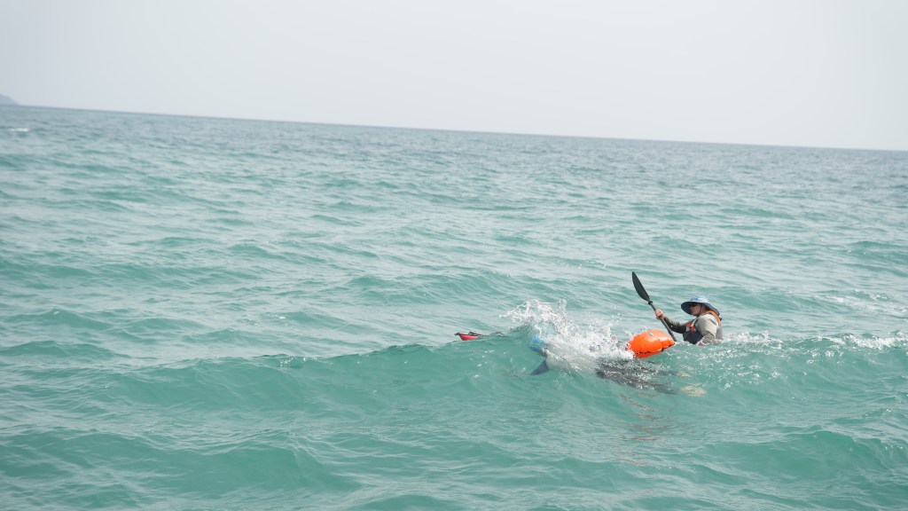 Jellyfish were another story. I opted to wear a long-sleeve rash guard, large goggles, and a swim cap to try and protect the front part of my body from hitting jellyfish. During the day, it was possible to see them sometimes, but nighttime was a lucky dip (excuse the pun). As I prepared to get into the water for my first night swim I really was questioning my motivation. Our routine for each swim was the support vessel would get us close to the starting waypoint, then Luke and I would enter the kayak, and Luke would paddle me right to the exact spot using his GPS to guide him.. Then I would put my goggles on and enter the water. Getting out of the dry and safe kayak into the pitch-black water was never high on my “favourite things I want to do right now” list. But there weren’t many other options, so I just got on with it and tried not to think about what might be underneath me and focus on my technique and following Luke. I had night lights attached to my goggles(we only used red lights at night as they don’t attract things apparently), and Luke had night lights on the kayak, so I concentrated on keeping about 2 m from him as he paddled parallel with me.