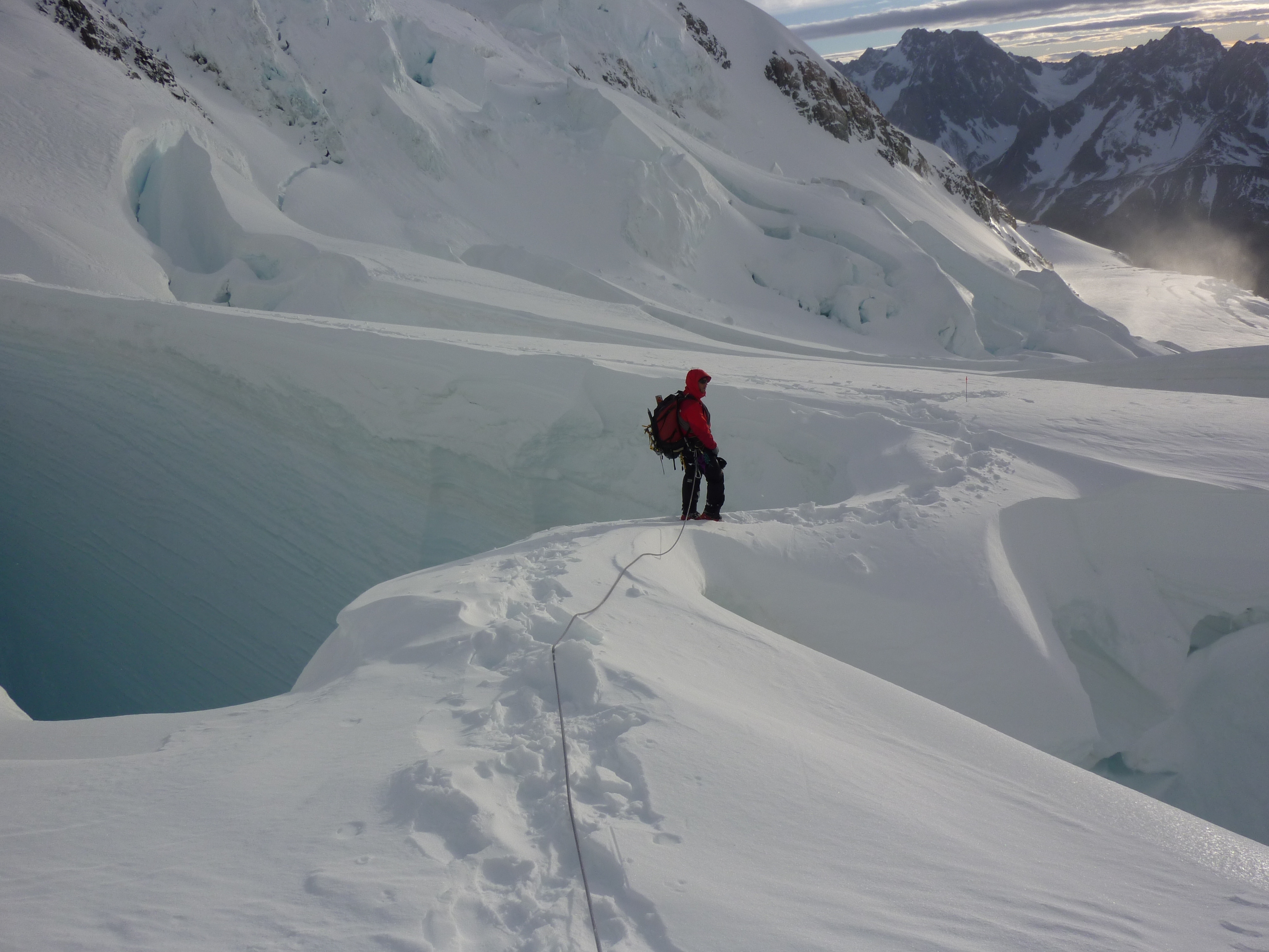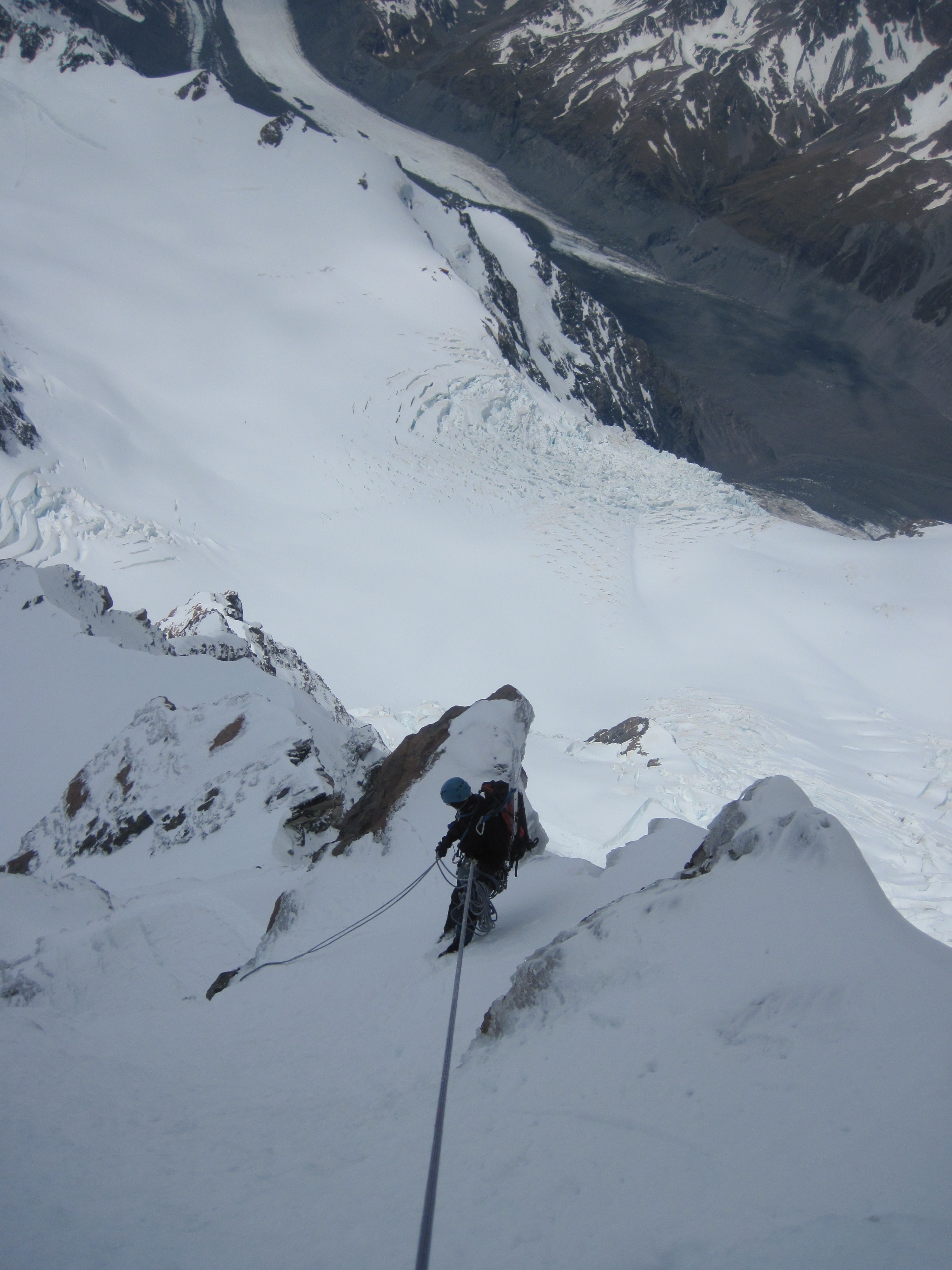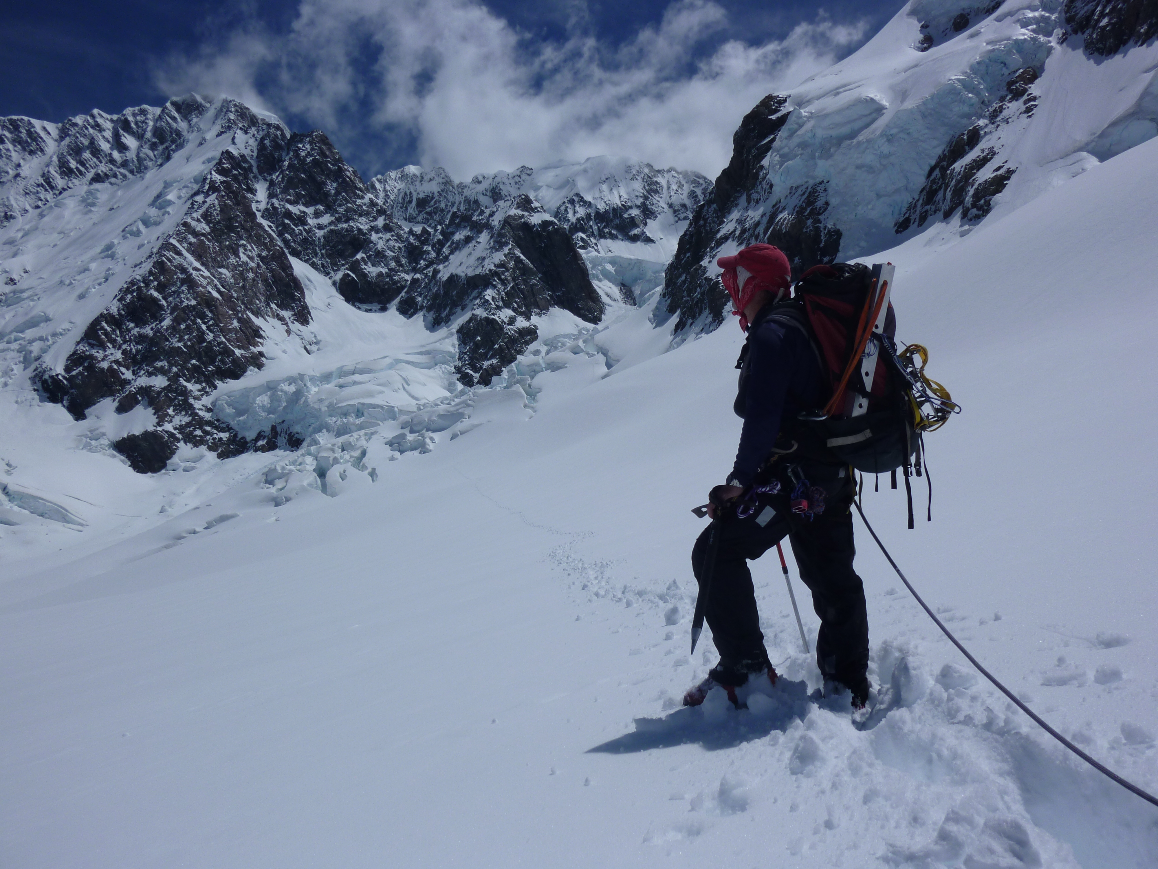 We first had the Linda Glacier with all her huge crevasses to negotiate. The first day we arrived we dumped our gear in the hut, roped up and crossed the plateau to the Teichelmann Corner. This corner was ‘interesting’ as it is threatened by seracs and rock fall from the Silberhorn ridge. We chose to sneak around under the serac’s as fast as possiblle. Access up the Linda from further out in middle of the Glacier was cut off due to a huge crevasse. As we crossed underneath it, we were pretty nervous as it was creaking and groaning and making all sorts of noises. We turned around on the lower Linda, happy to have scoped out the route for a planned early 1AM start in the morning.