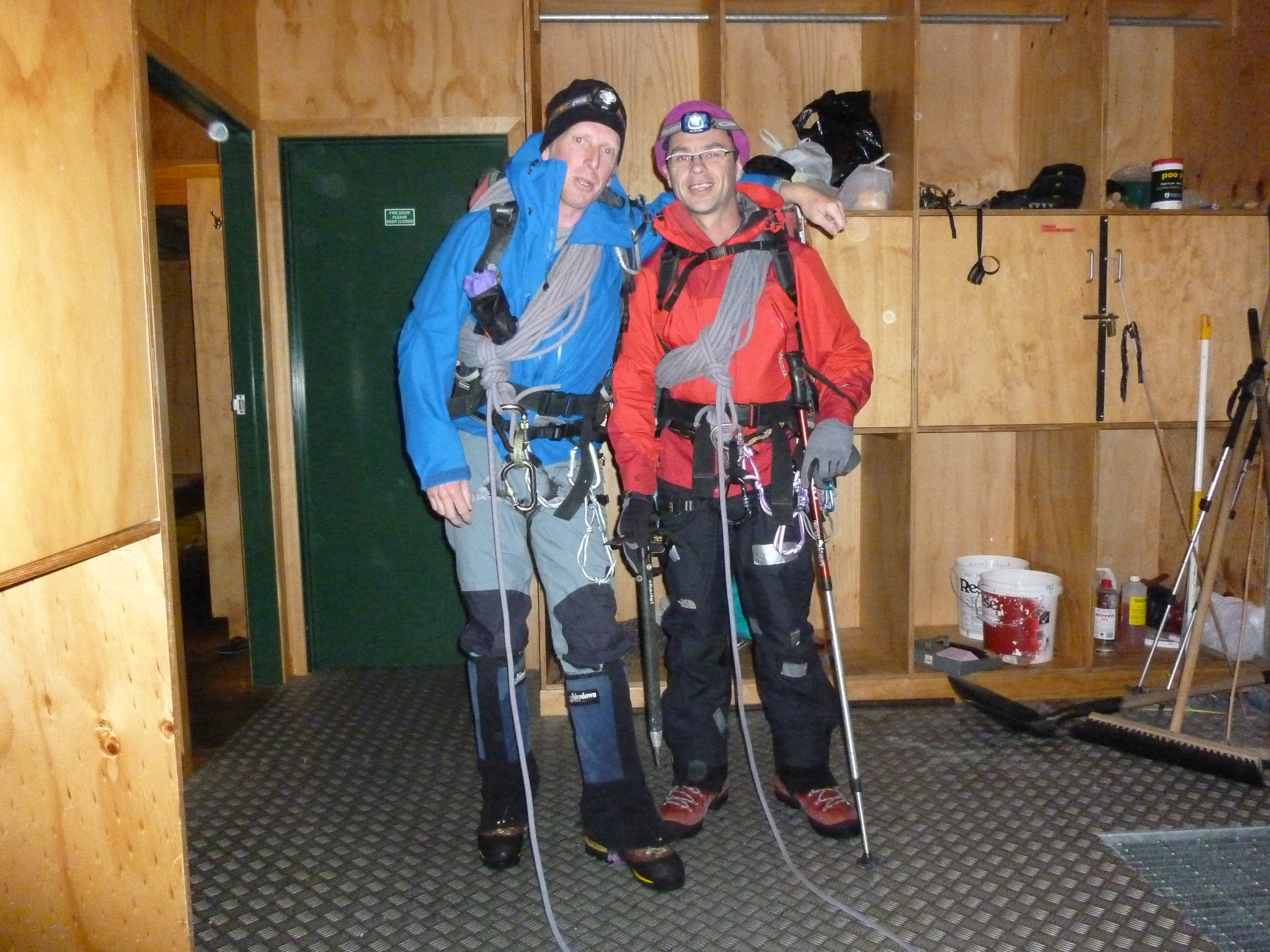 As we finally dropped down over the famous Bergschrund we saw Dave’s axe lying in the snow at the bottom of a steep gully at the base of the summit rocks. He wanted to go and get it, I really could not be arsed, especially since we would have to climb somehow back over the Bergschrund, which was now melting and very soft after all day warmth, and not in a nice condition to try and get back over. So we left the axe and headed back down, for an uneventful trudge all the way back down the Linda Shelf, down over the avalance debri under the gun barrels, and onto the lower Linda, weaving our way in and out of the crevasses and over narrow snow bridges. The last hurdle was the race under Teichelmann Corner. Once again it was creaking and groaning and I was REALLY nervous, we tried to semi-run under it, it was more of a swift walk. That night as we were safely in the hut the reason for our anxiety became realised as the entire corner unloaded and spewed a huge trail of rock and ice over our tracks from that day. Arrived back at he Plateau Hut 19.5 hours after leaving – a mammoth day but very very happy!