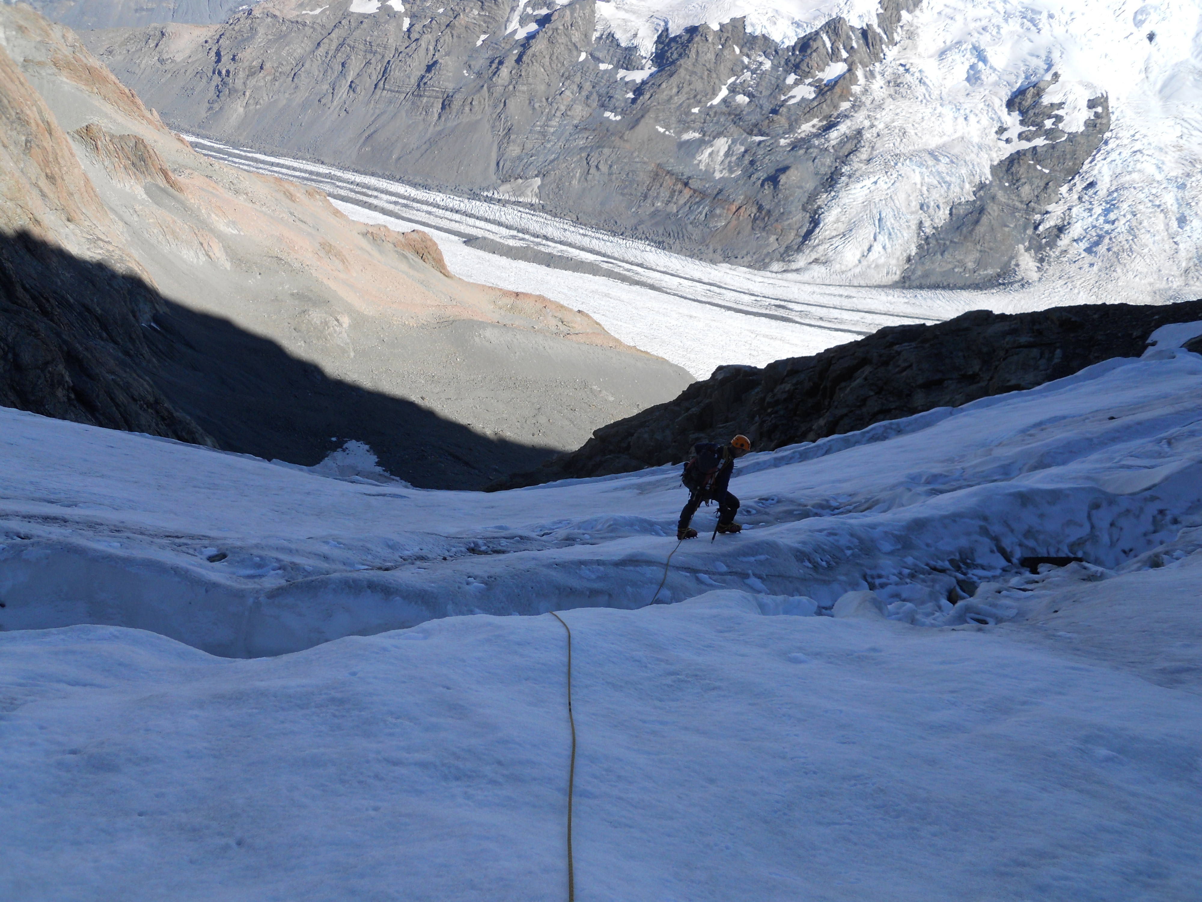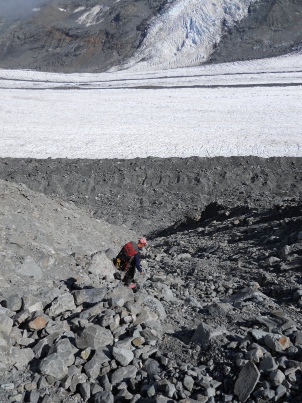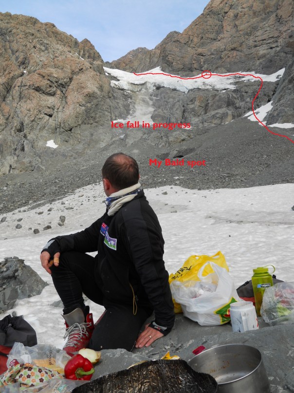 As we swapped our clothing, 3 or 4 of these screamers came down high off the west ridge and smacked into the icy darkness very close to us. I immediately cowered down on the ice then freaked out and said to Alan “let’s get the hell out of here”. Alan calmly said “no worries lets just get in closer to the rock”. I was still very uncomfortable and very happy to leave a couple of minutes later where we could get out into the middle of the glacier where the rock coming off the west ridge could not reach us.