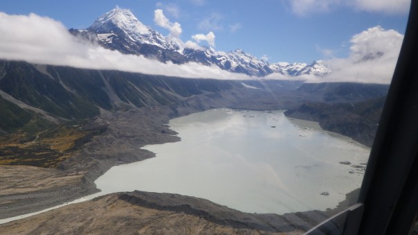 I called Mt Cook Ski planes that afternoon using the Iridium Sat phone to see if we could get a flight out. It was clear day and ideal flight conditions. Unfortunately the chopper was not working for some reason so we booked in for the next day. We had a relaxing day sleeping and eating. The next morning we woke to the whole valley socked in cloud. We could have been picked up from the site of the old Malte Brun hut, but as it was cloudy we decided to descend back down to the Tasman glacier. Once down the steep loose moraine walls we wandered around the glacier looking for a flat spot to land. Alan finally spotted one on the far side of the glacier – as we wandered over we saw a strange object though the cloud. It turned out to be a snow plow. This was a great reference point to explain our location to the Mt Cook Ski Planes. Some more calls on the sat phone and as soon as the cloud lifted we were in the chopper and whizzing back to Mt Cook Village. Once again we were lucky to share the flight out with a party from Alpine guides so it only cost us NZ$180/each for the flight out (As opposed to over NZ$700 if we had called the flight in all for ourselves).