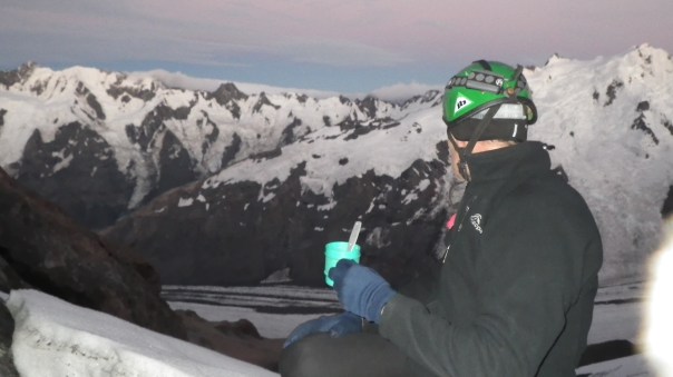 In a situation like this, standing on one foot on that small ledge in the pitch dark, hundreds of metres off the glacier below, on the move for 20 hours straight, I can’t think of a better person to be with than Alan. He very calmly, with only one brief expletive, said “no worries, I guess I will just climb up and retrieve it”. Off he went back up the vertical world in darkness, climbing until he reached the end of the jammed rope where he managed to wrap a prussic around both ropes for some basic form of protection and continued all the way back to the anchor. Here he calmly sorted out the entanglement then abseiled back down to join me. This of course took some time, during which I clung to the belay stance, alternating my weight from one foot to the other, cursing myself for not being careful enough with the ropes as I descended. To add to my enjoyment, a ‘screamer’ came whistling past my head, far to close for comfort. I pressed myself in against the cold rock in the darkness in a pathetic effort for protection.