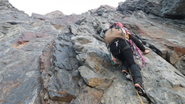 We set off up the rock around 7AM. The first pitch looked intimidating to me wearing plastic boots. It involved a crack and some foot jams. ‘Shit – this is way harder than I expected’ I thought as I grunted and struggled up the first pitch. It was around a grade 14, and turned out to be the hardest pitch of the day. After this we alternated between simul-climbing and pitched climbing on the steeper and more exposed sections until we gained the ridge. The climbing was generally straight forward however generally loose so care needed to be taken to avoid rockfall. It is quite exposed especially as you get higher up. Alan led all the difficult pitches. I was interested in economy and speed of travel, and him being the far better rock jock, was happy to let him take the sharp end so we could make good time.