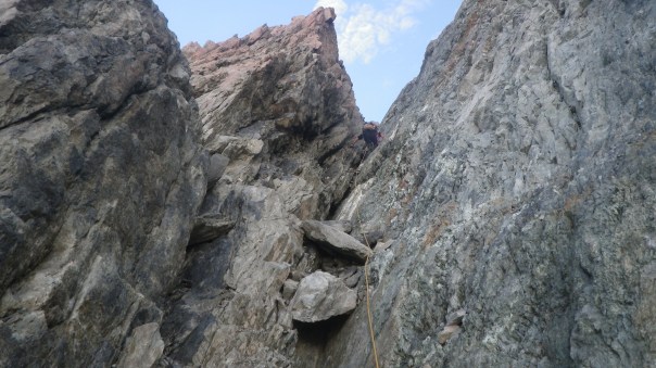 Rockfall is a real issue on this route. I think a party of two is safer than larger parties where the possibility of climber initiated rockfall is much higher