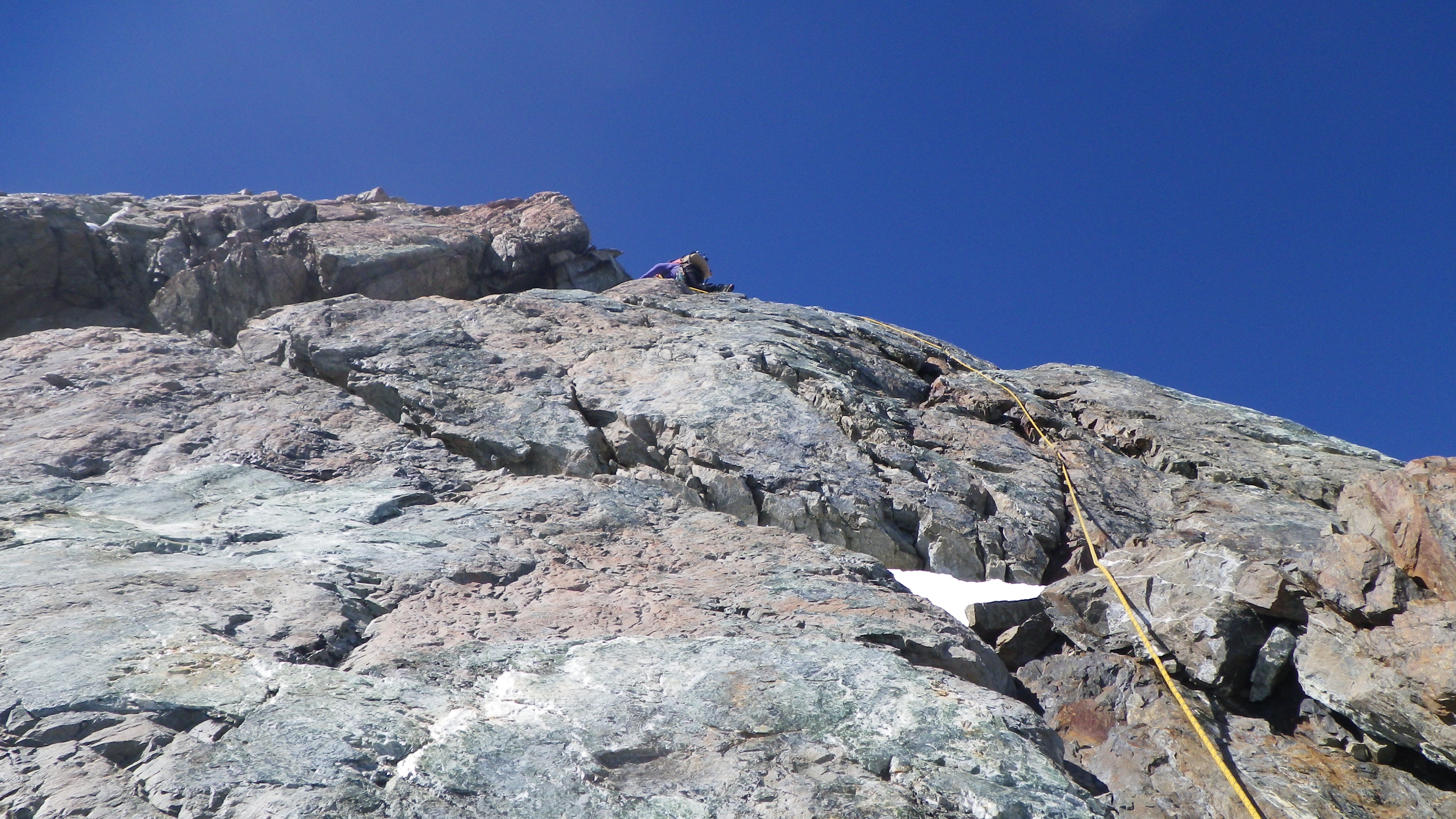 Once on the West ridge, we traversed along for 50m to a point where we realized (at around 2950m) we had turned back last year. This is just before the Cheval sections. There are actually two cheval type sections. We thought we had reached the true cheval at one point and took some photos crossing it. We then come across another section shortly after which looked more recognizable from other climber’s photos. It has some really nice exposure as you cross, and can be traversed on ledges on the Northern side. I did try the classic sit on your ass technique for a metre until I realized how uncomfortable and painful it was. It almost severed my important pieces, so I reverted to climbing around the ledges on the side.