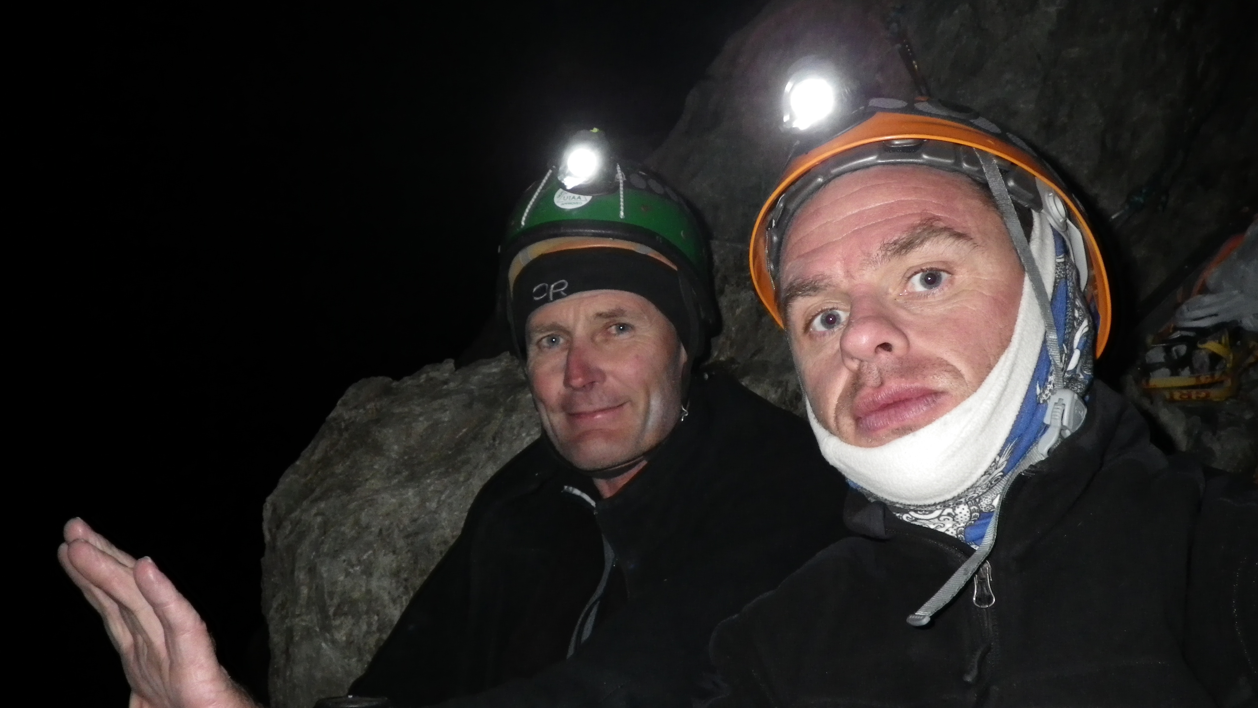 We laid our packs and ropes on the ledge and sat down on top of them. I had travelled light and had very little warm clothing to put on. Two thermal tops, a polar fleece, a Gore-Tex jacket, thermal pants, shell pants, balaclava. Everything went on. While we were moving I felt comfortably warm. After stopping for 30 minutes I began to get cold. The cold increased throughout the night all the way to the morning. For the first hour or two we talked and joked and laughed, until tiredness overtook us. I was too cold to sleep though and had to keep standing up on the tiny ledge and do exercises to warm up. If there had been enough room to do star jumps without falling off I would have. Instead I reverted to shadow boxing, press-ups and waving my arms in windmills for as long as I had the energy. After 10 minutes of this every hour or so, I would warm up enough to sit down again. I really got uncomfortably cold even though it was a mild night. We estimate the temperature to be have been around -3 to – 5 degrees.