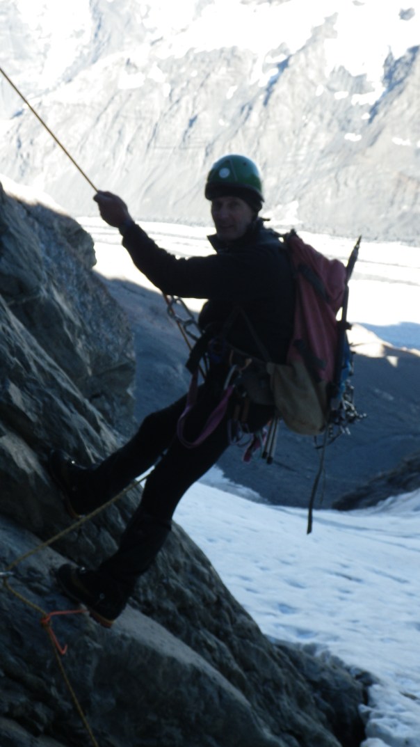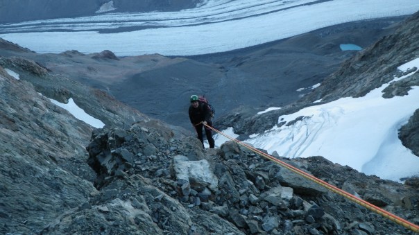 Rappelling the loose rock was very slow. The rope was forever getting caught up on the sharp edged rocks and stones. Extreme care needed to be taken not to knock anything down on your partner below or the rope below incase the rock cut through the rope as it had done to us the year before. To top that off when we got to the bottom of each abseil, pulling the ropes down proved very troublesome and they often got tangled and caught. Around 11pm it was well and truly dark. We were slowly getting lower however still along way off the glacier. It was too dark to see exactly what way to rappel down through the systems of gullies and rock bands. One particular abseil ended a few metres above the closest rock ledge. On a vertical slab with very few hand or footholds. As I slithered down to the end of the ropes to join Alan, I saw how uncomfortable and exposed the belay spot was. He pointed out a small foothold where I could just fit one foot on at a time. As I clung there standing on one toe, and started to pull down the ropes from above me, I thought to myself – shit this is one position we definitely cannot afford the ropes to get stuck on the way down. Murphy’s Law came into play. They jammed fast.