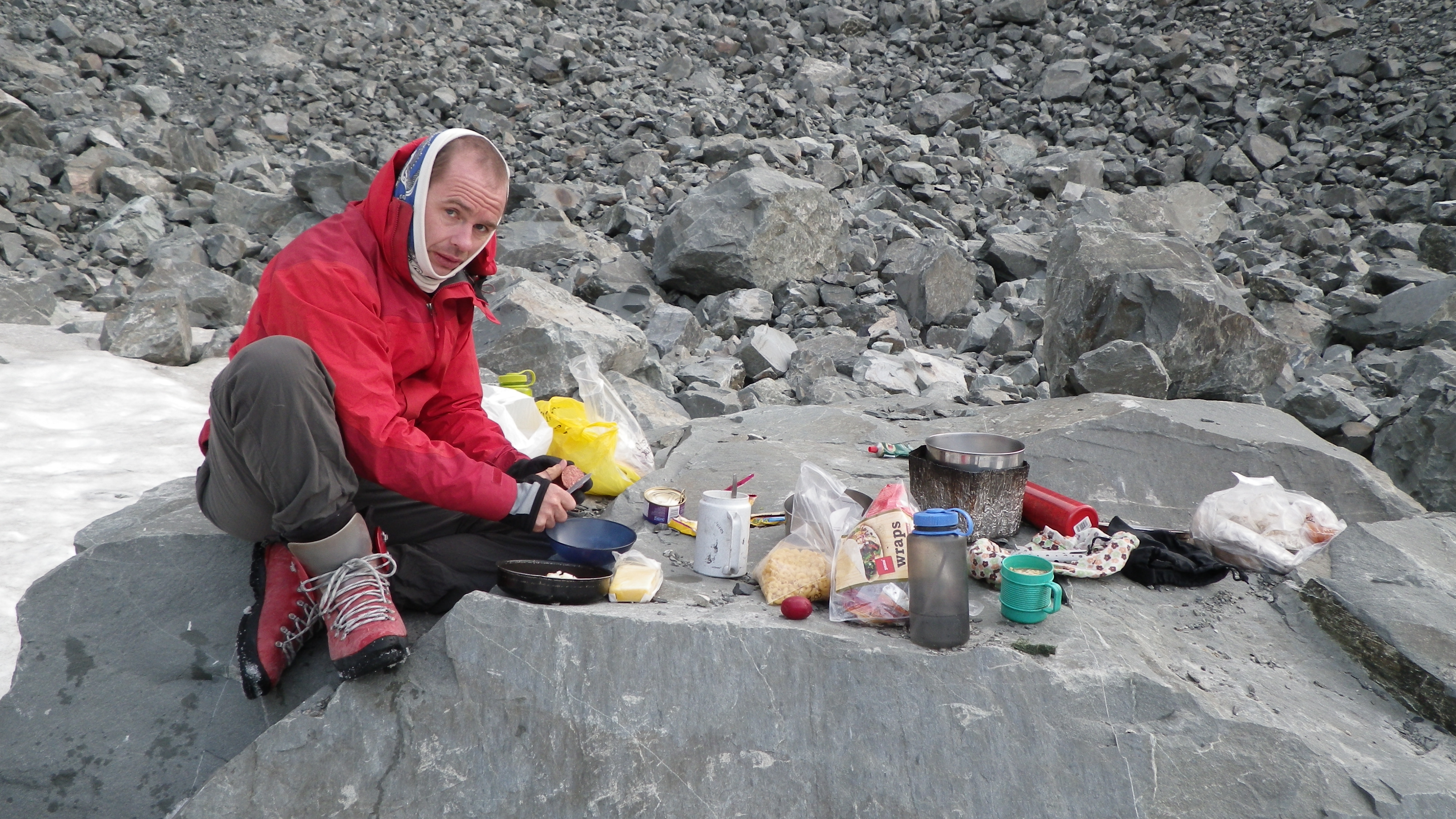 We arrived around 5PM. I felt a little tired and was happy to take off the pack, set-up the tent and cook a nice meal of pasta with tomato and tuna. Looking up at the Malte Brun Glacier we scoped a route for the next morning’s early start and prepared our gear.