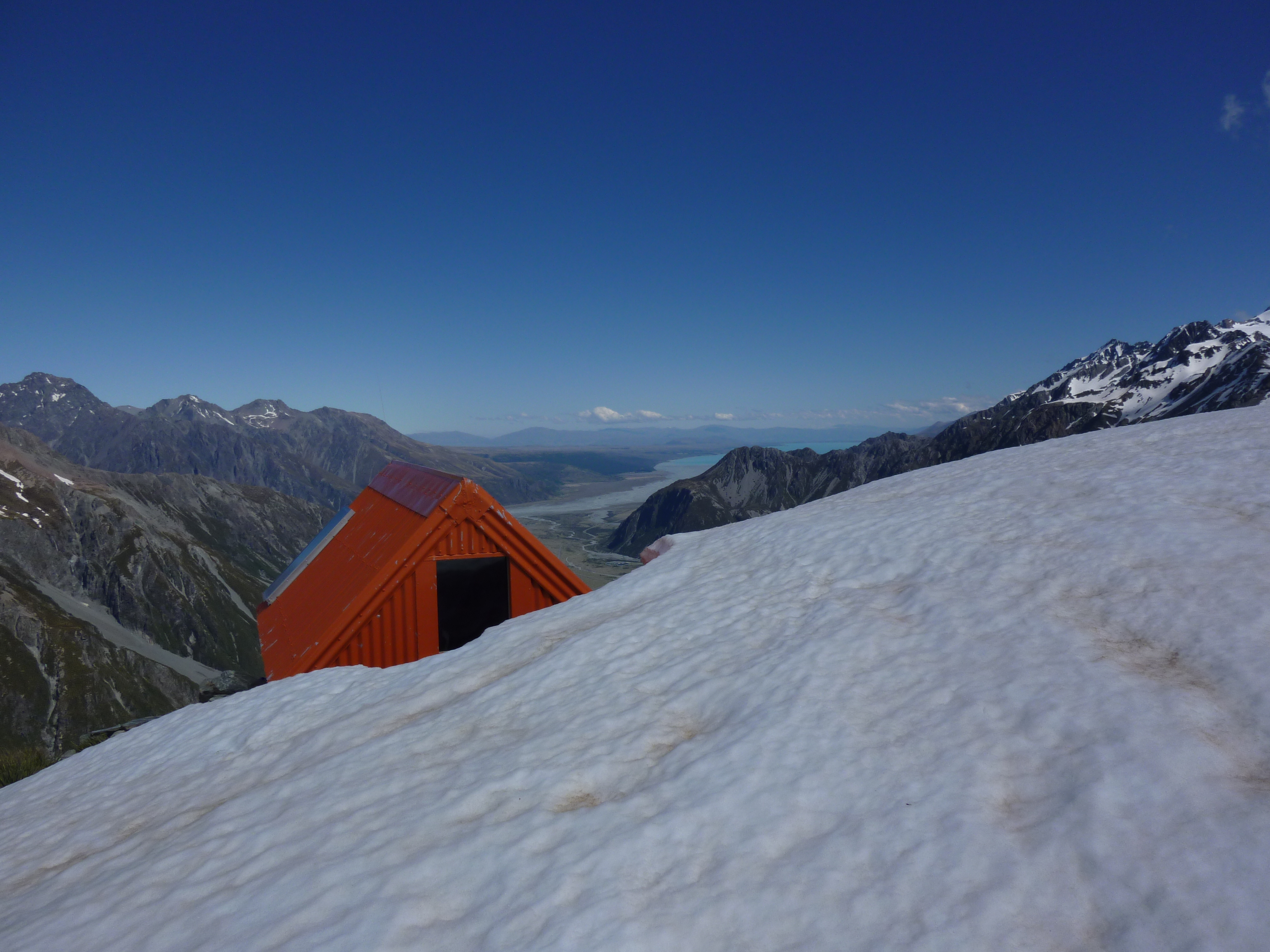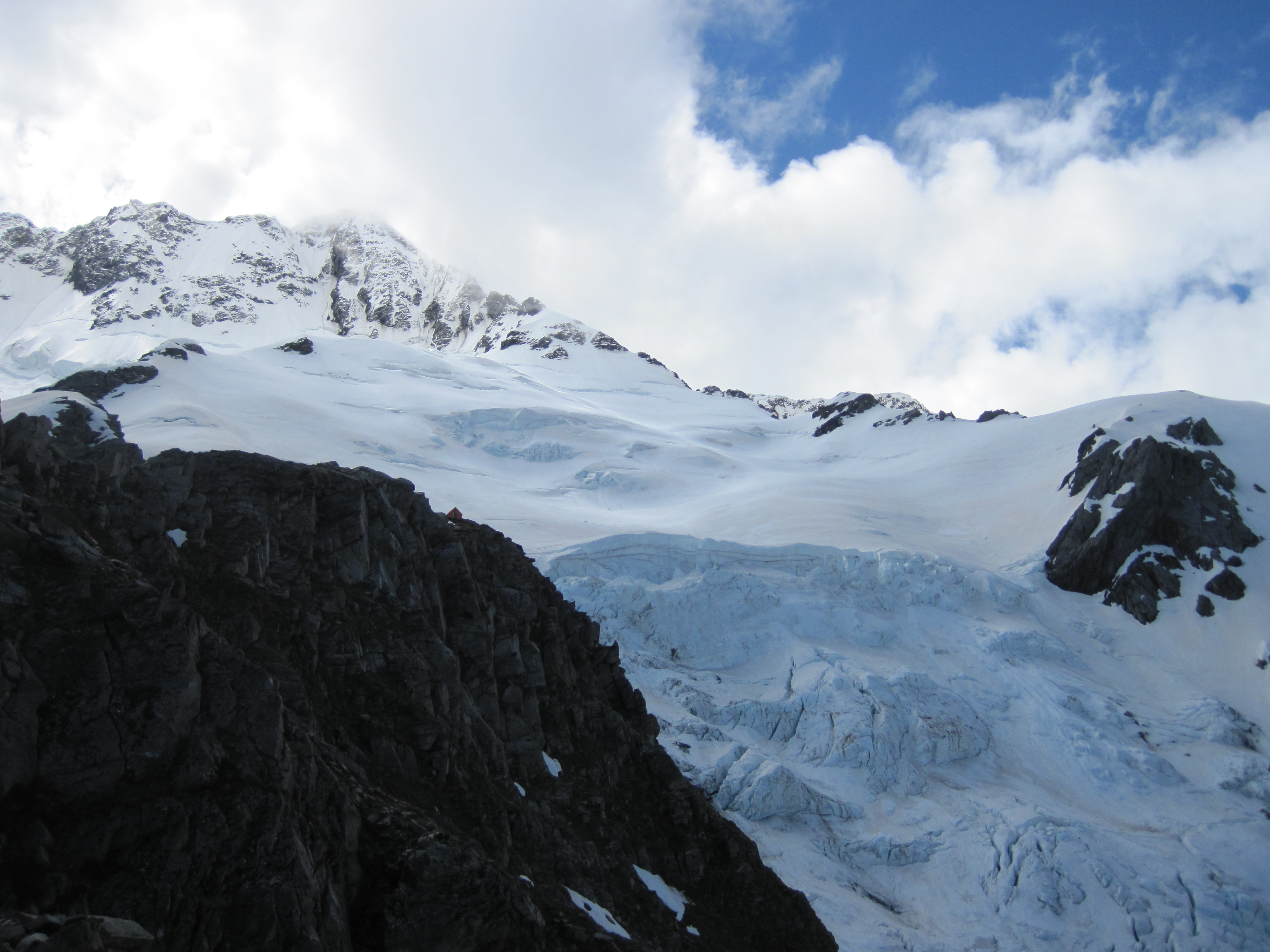 The Footstool is a mountain located in the Southern Alps of New Zealand, just outside Mt Cook Village. Footstool’s summit sits at 2764m and is on the main divide overlooking the confluence of the Mueller and Hooker valleys, with exceptional views of Mt Cook’s South Face. From the summit there are views to the Copland valley and the West Coast. In 28th and 29th November 2009, together with David Ellacott we attempted to climb the Footstool via the main divide route from Sefton Bivvy. This route is graded as a 2+. The route starts at Mt Cook Village. We walked in via the hooker track, turned off and scrambled up steep scree, tussock and rock ledges to access Sefton Bivy nestled below Mt Footstool and Mt Sefton. We stayed here overnight then the next morning made a late start at 7:20AM (due to some other climbers turning up and crowding the hut so much we couldn’t get out until they left!). It was a clear day but as we crossed onto the main divide became very windy. It was our first time on a mountain in over a year, and we made a mistake by leaving the rope at the top of the Eugenie glacier and attempting to solo the final slopes to the summit. These were really hard ice and collectively we made a decision to turn back, 170m from the top. If we had our rope we could have pitched it safely as there was only one steepish bulge to get over which we felt uncomfortable on. I partly regret the decision however the mountain will always be there.