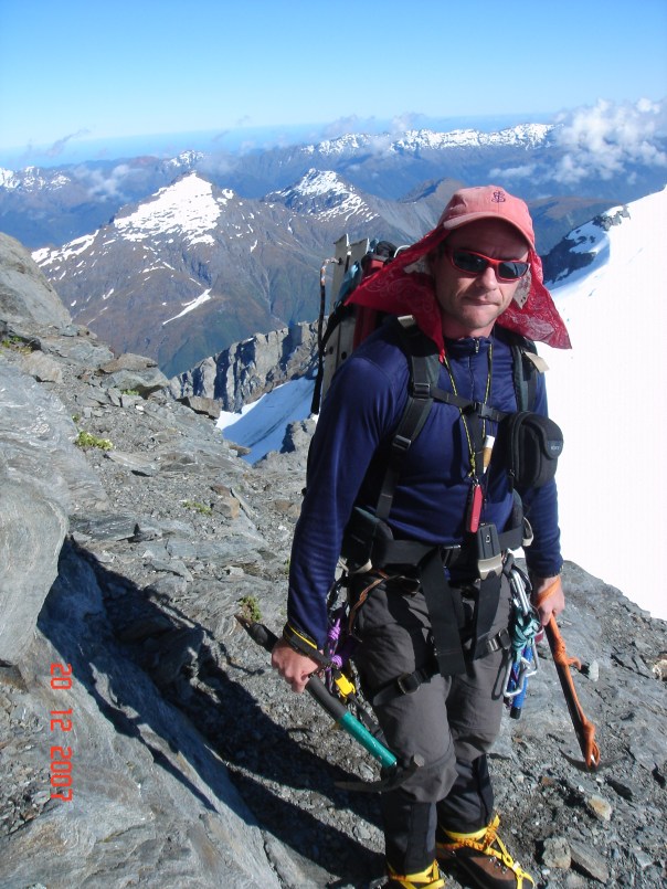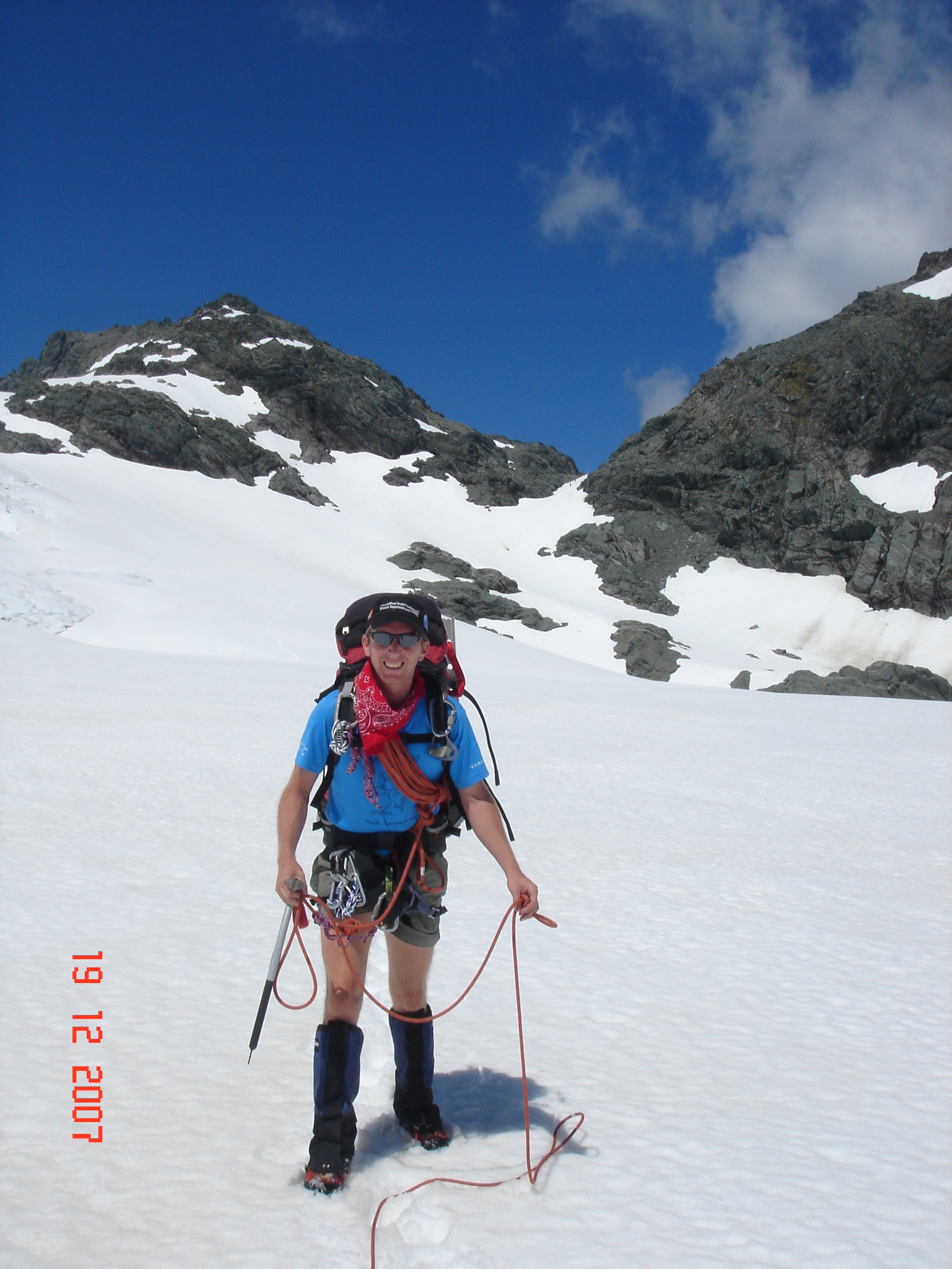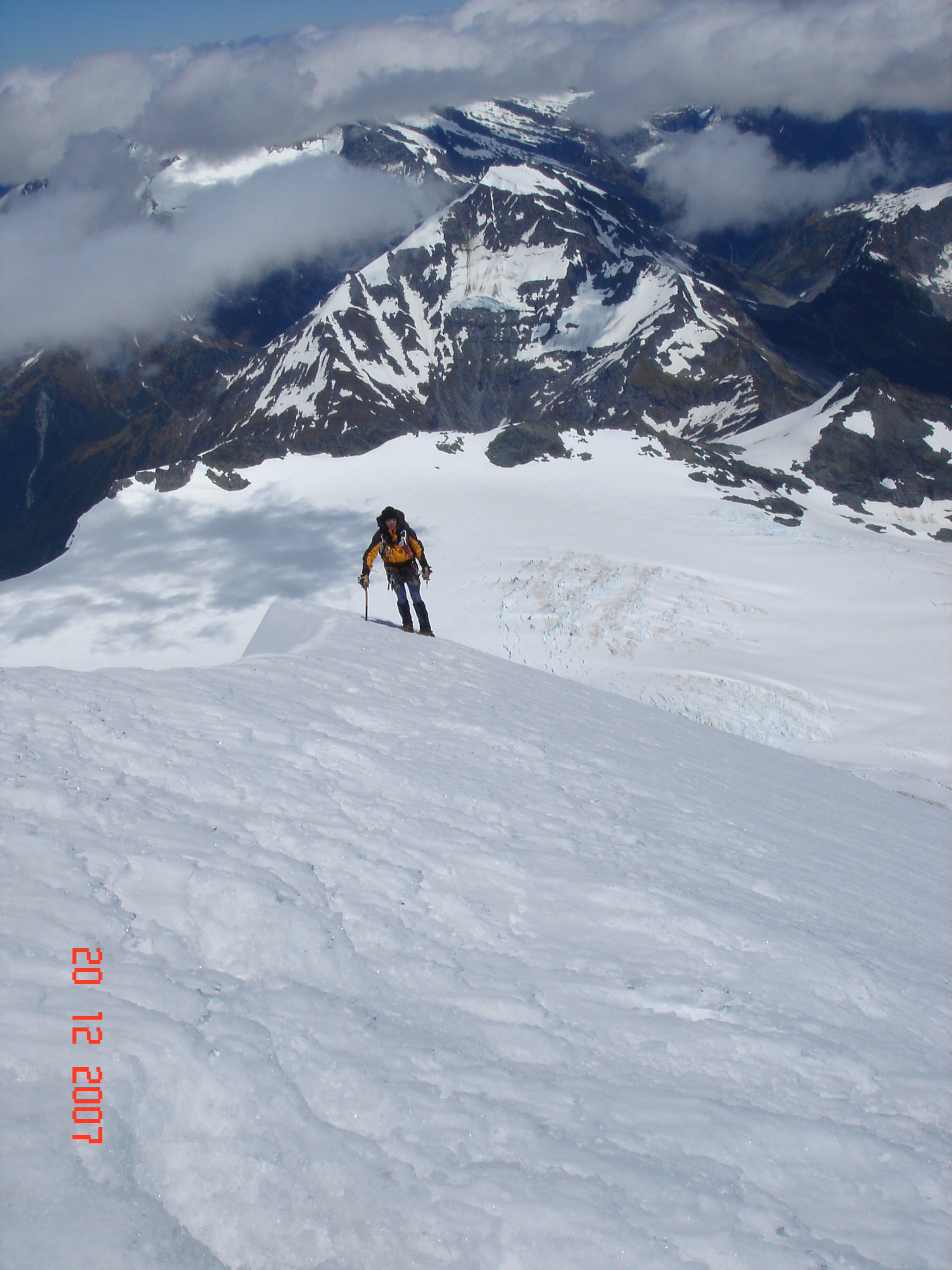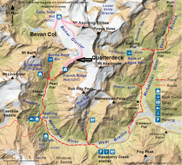 An aerial view of Mt Aspiring, the North West ridge is the prominent ridge line on the left. Photo: Craig PottonThe Aspiring National Park. Our route shown in pink. Starting from Bevan Col where we were dropped off by chopper, crossing the Bonar glacier to Colin Todd Hut. The Ascent up the North West Ridge to the summit, before heading out up the Bonar glacier, crossing the quarterdeck to access the descent down French Ridge and following the river to Raspberry Flats road endSaying goodbye to the helicopter as it drops us off at Bevan Col. The chopper trip saves a 2 day walk-in. We opted to fly in and walk out due to the fact the weather window looked like we needed to summit the next day after arriving and would have allowed time to get in and out again.David Ellacott roping up to cross the Bonar glacier to Colin Todd Hutt.David Ellacott on an early morning start works his way through the crevasses on the Bonar glacierCaught with my pants down.Onto the rock of the North West Ridge – there is an easy scramble up here which can be done solo, however it's very easy to loose the route and get into some real steep stuff. Once you feel like you need to rope up you are probably off route.David Ellacott finds some of that steeper stuff.The summit ridge – nice and clean, but hard ice so no place to slip as we solo'd the entire route to the summit.David Ellacot picks his way carefully up the summit ridge.On top of Mt Aspiring – beautiful day and the feeling all sweeter as this was my second attempt.David Ellacot downclimbing hard ice on the summit cap of Aspiring, we maybe should have pitched this. This is a definite no slip zone.David Ellacott prepares to rappel on the descent. We made 4 abseils with a 60m doubled up rope to get down the Northwest ridge rock buttress.And off he goes.On the walkout. Stopping off at a deserted French Ridge hut for a rest and a look at the view.At the bottom of French Ridge – glad to be down from the steep ridge. Now just to cross the stream and the gentle stroll out following the river to Aspiring hut.Boots off to cross the Matukituki riverWalking out from Aspiring hut to the road end at Raspberry Creek. The Matukituki valley is the most beautiful valley I have ever laid eyes on.