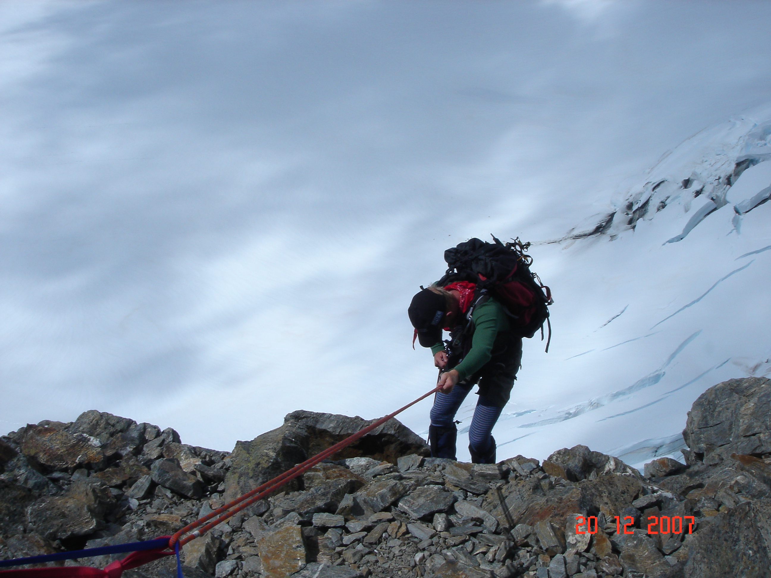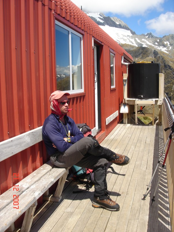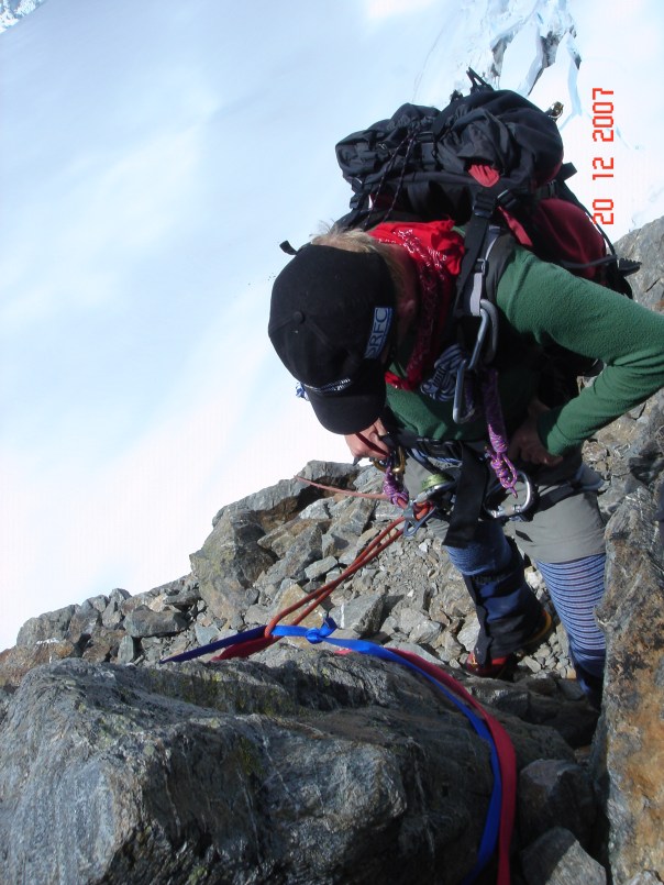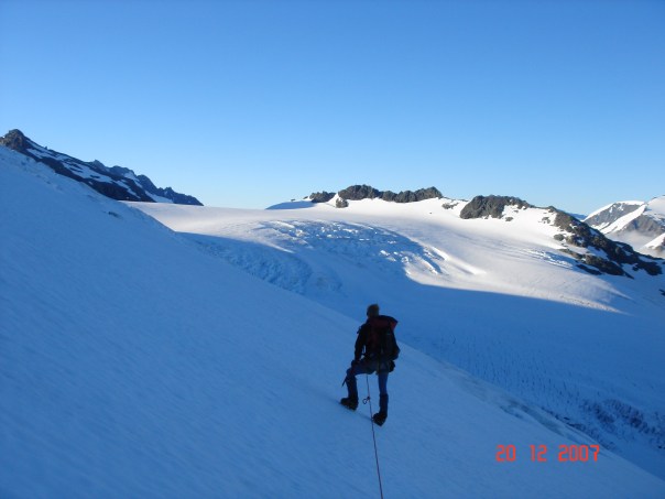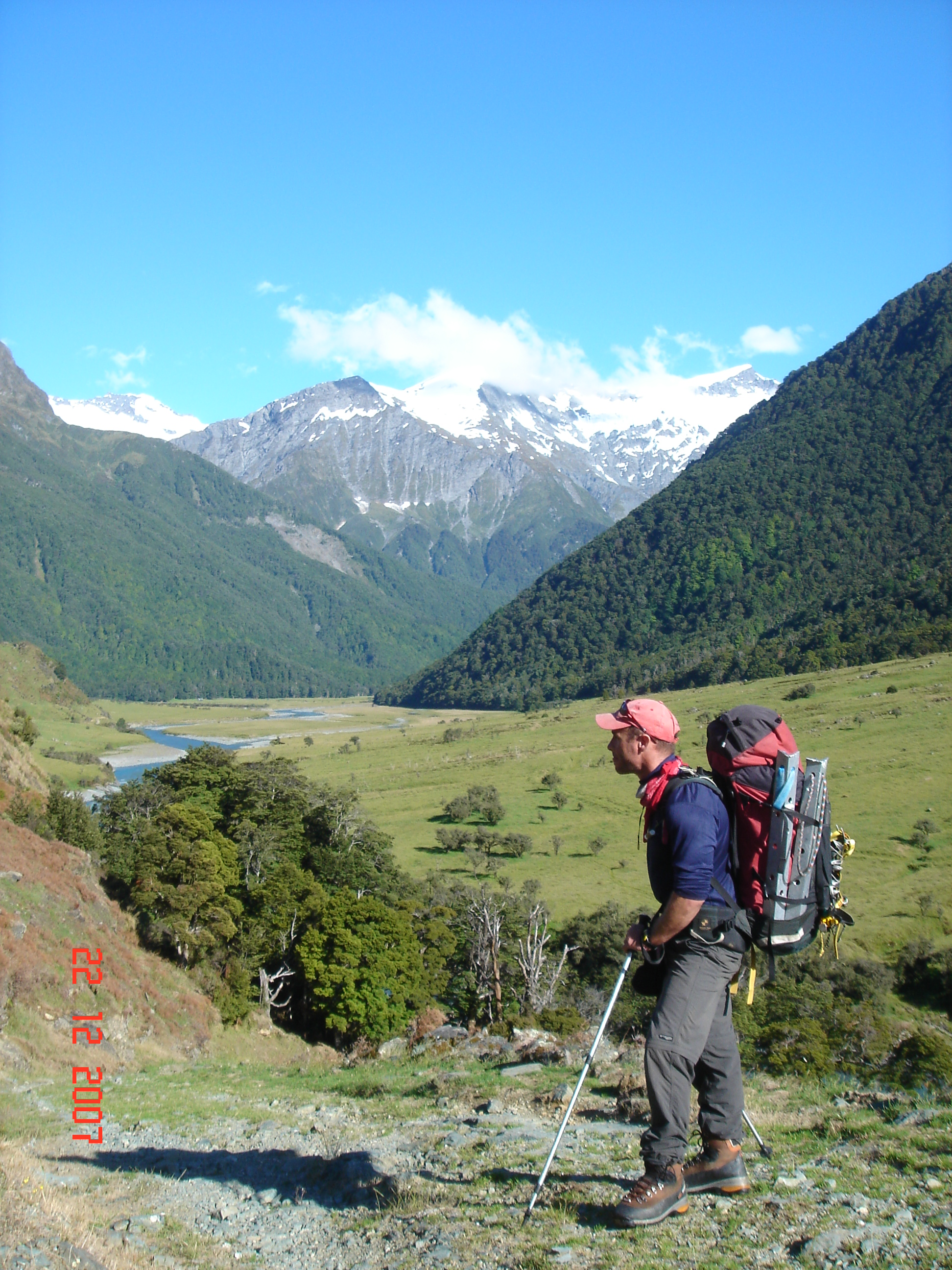 An aerial view of Mt Aspiring, the North West ridge is the prominent ridge line on the left. Photo: Craig PottonThe Aspiring National Park. Our route shown in pink. Starting from Bevan Col where we were dropped off by chopper, crossing the Bonar glacier to Colin Todd Hut. The Ascent up the North West Ridge to the summit, before heading out up the Bonar glacier, crossing the quarterdeck to access the descent down French Ridge and following the river to Raspberry Flats road endSaying goodbye to the helicopter as it drops us off at Bevan Col. The chopper trip saves a 2 day walk-in. We opted to fly in and walk out due to the fact the weather window looked like we needed to summit the next day after arriving and would have allowed time to get in and out again.David Ellacott roping up to cross the Bonar glacier to Colin Todd Hutt.David Ellacott on an early morning start works his way through the crevasses on the Bonar glacierCaught with my pants down.Onto the rock of the North West Ridge – there is an easy scramble up here which can be done solo, however it's very easy to loose the route and get into some real steep stuff. Once you feel like you need to rope up you are probably off route.David Ellacott finds some of that steeper stuff.The summit ridge – nice and clean, but hard ice so no place to slip as we solo'd the entire route to the summit.David Ellacot picks his way carefully up the summit ridge.On top of Mt Aspiring – beautiful day and the feeling all sweeter as this was my second attempt.David Ellacot downclimbing hard ice on the summit cap of Aspiring, we maybe should have pitched this. This is a definite no slip zone.David Ellacott prepares to rappel on the descent. We made 4 abseils with a 60m doubled up rope to get down the Northwest ridge rock buttress.And off he goes.On the walkout. Stopping off at a deserted French Ridge hut for a rest and a look at the view.At the bottom of French Ridge – glad to be down from the steep ridge. Now just to cross the stream and the gentle stroll out following the river to Aspiring hut.Boots off to cross the Matukituki riverWalking out from Aspiring hut to the road end at Raspberry Creek. The Matukituki valley is the most beautiful valley I have ever laid eyes on.