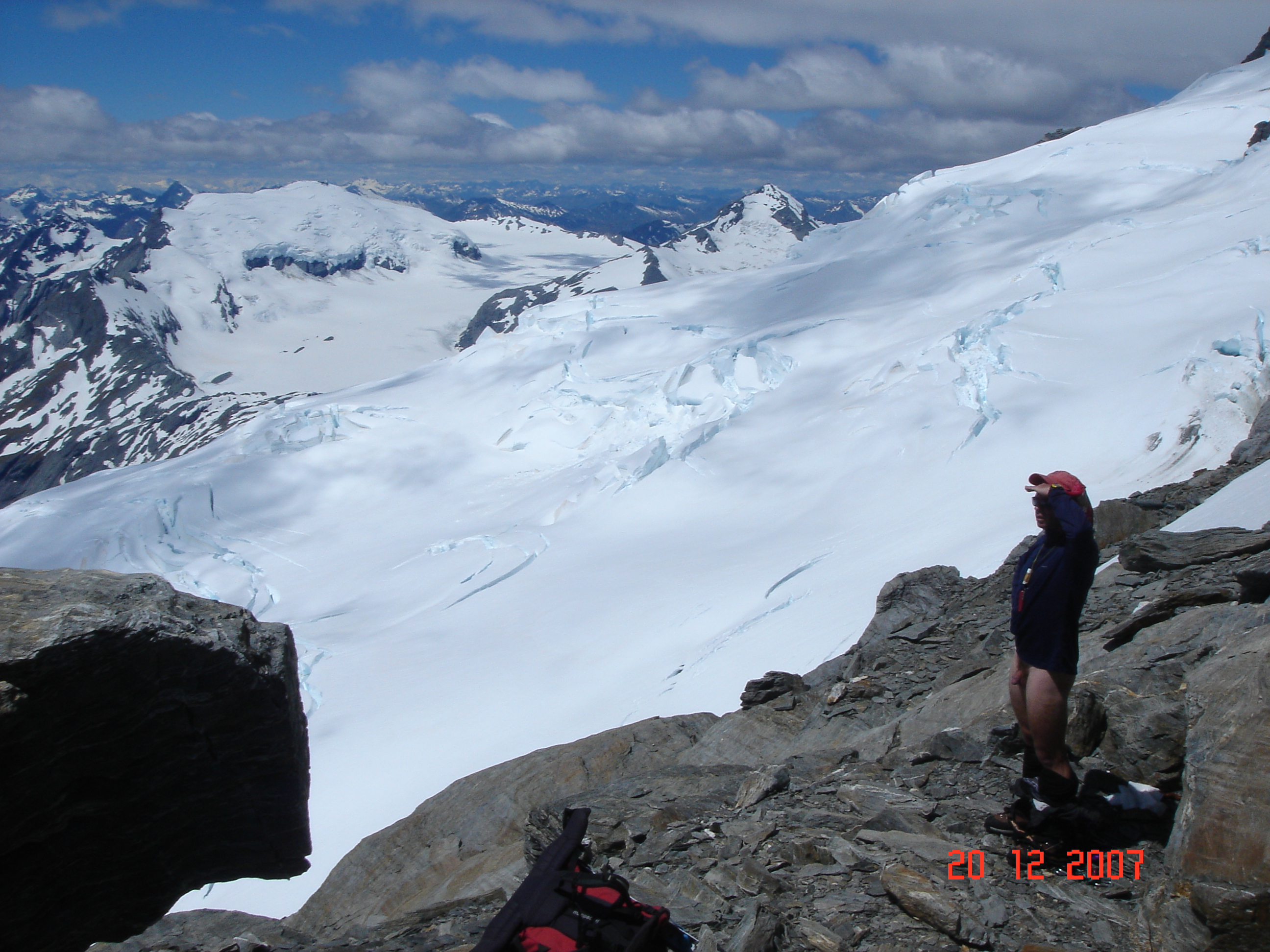 Mount Aspiring / Tititea sits slightly to the west of the main divide, 30 kilometres west of Lake Wanaka. It lies at the junction of three major glacial systems — the Bonar Glacier, which drains into the Waipara River, and the Volta and Therma Glaciers, which both drain into the Waitoto River. The Waipara is a tributary of the Arawhata River, and both the Arawhata and Waitoto Rivers flow out to the west coast in between Haast and Jackson Bay.