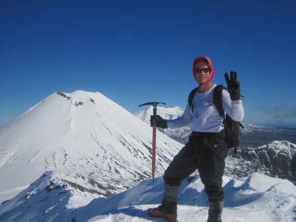 Standing on the summit of Ngauruhoe, pointing to Mt Taranaki in the distance – the first mountain I ever climbed at age 13