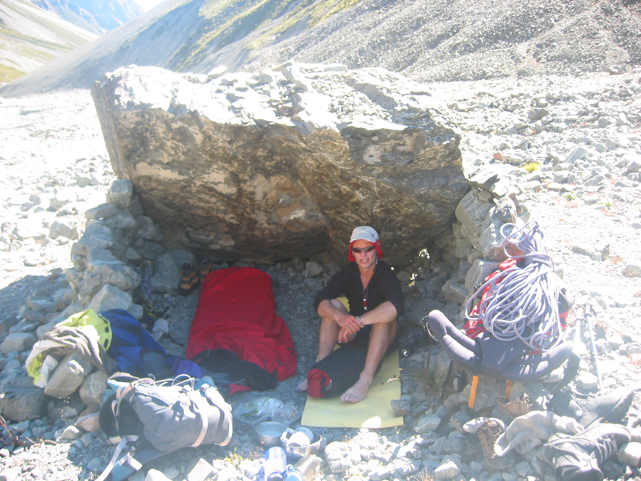The Nun’s Veil is 2749m ASL and is located in the Mt Cook National park, South Island, New Zealand. It is a great trip because you do not need to fly in. It takes two big days and is a real adventure. I climbed it in January 2005 together with Vanessa Wills. Getting to the base of the Nun’s Veil is interesting in itself. We took a boat (you can book the Tasman glacial lake guiding company to get you across) across the Tasman Lake, then walked/bush bashed/boulder hopped up the Gorilla stream for a few hours. There is a nice little rock bivvy site there. It does not give 100% protection so you would need a fly if it was a wet night. Then the next morning we climbed the route, had some lovely views from the summit, then descended all the way back to the Tasman lake. We had pre-arranged a pick-up with the boat the day before and got there just in time!